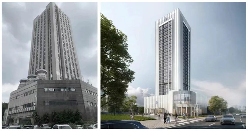 左为改造前的上海江天大厦,右为改造后的三航院企业总部大楼效果图