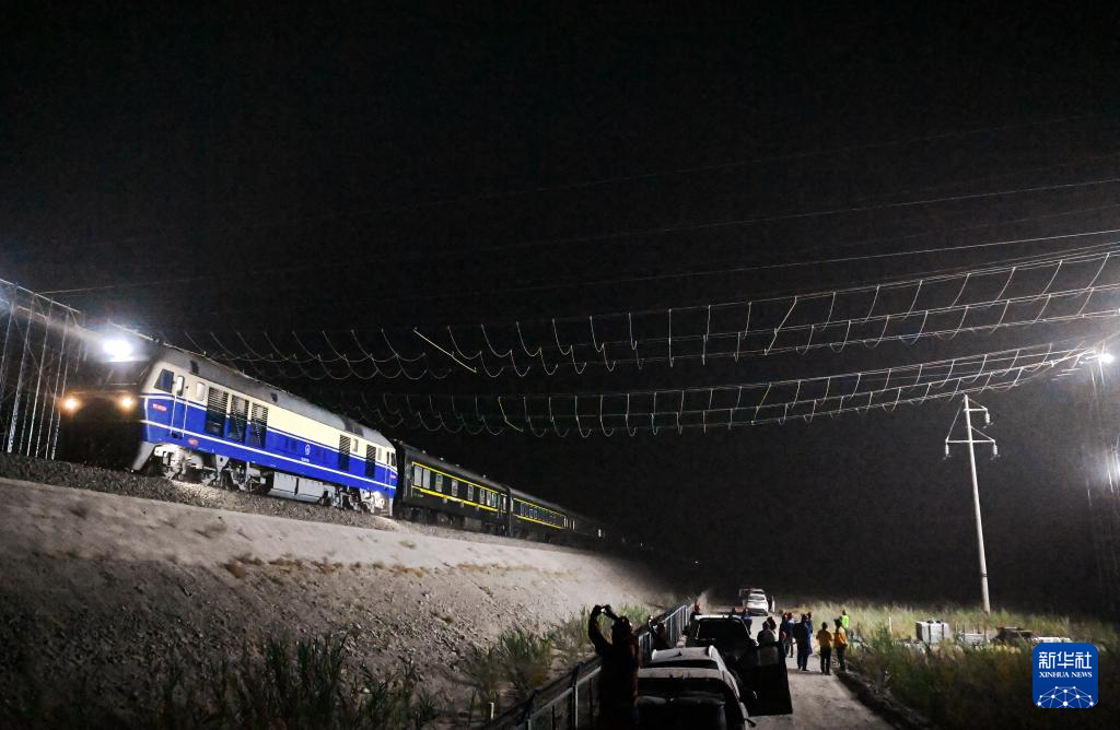 在位于新疆民丰县境内的和田-民丰-且末-若羌750千伏输变电工程跨越和若铁路作业现场,一列客车从跨越网下驶过(7月10日摄)。