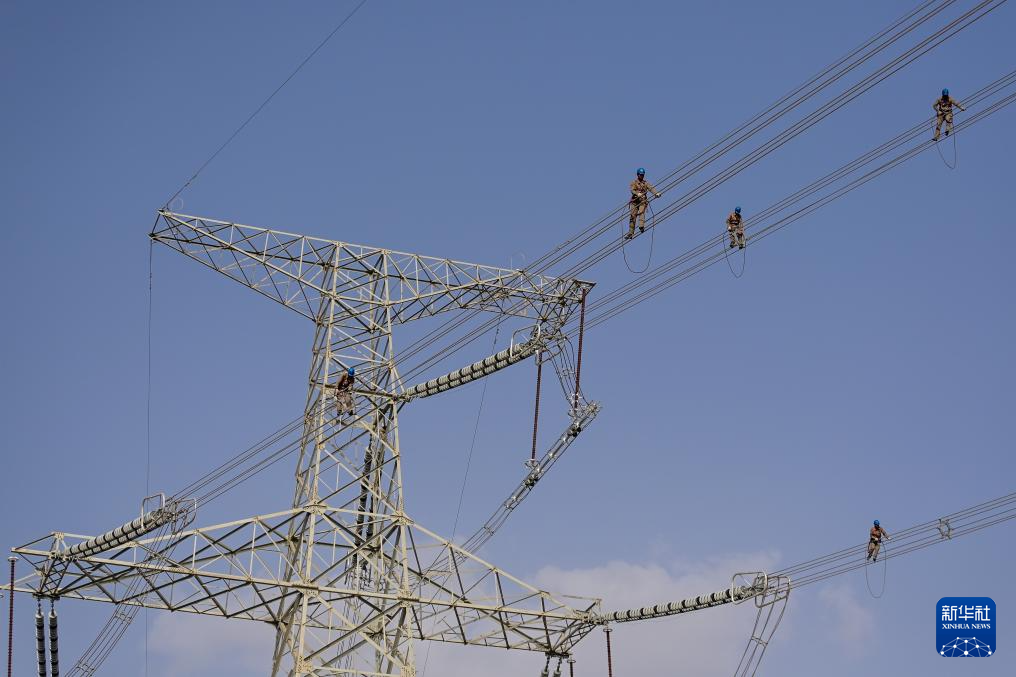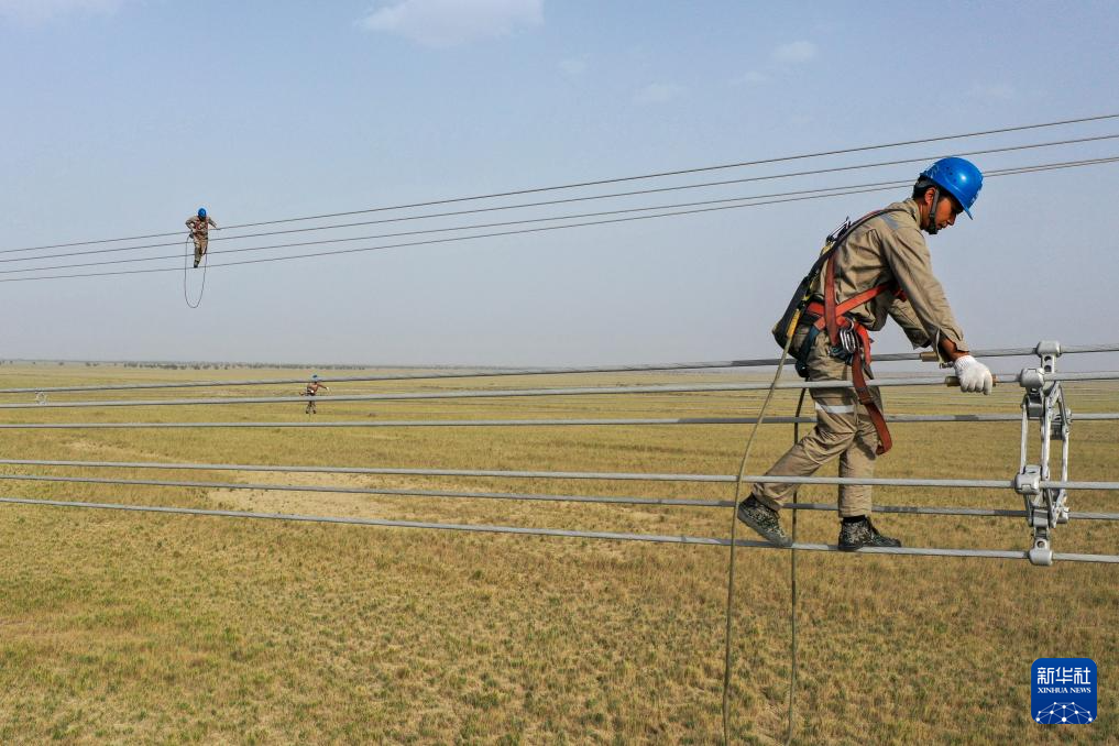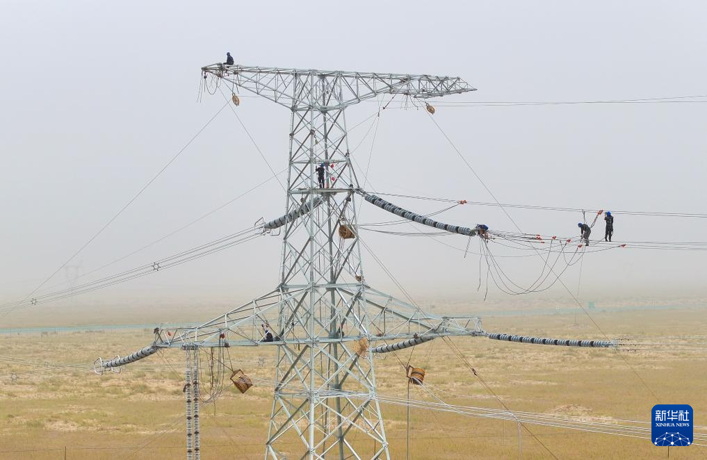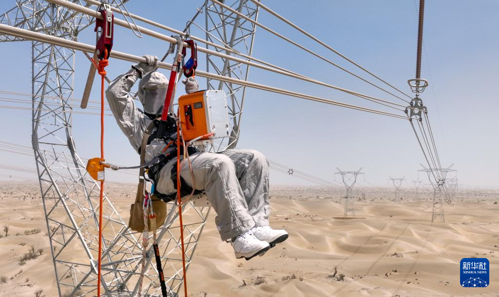 施工人员在且末-若羌750千伏线路开展走线消缺工作(6月24日摄)。