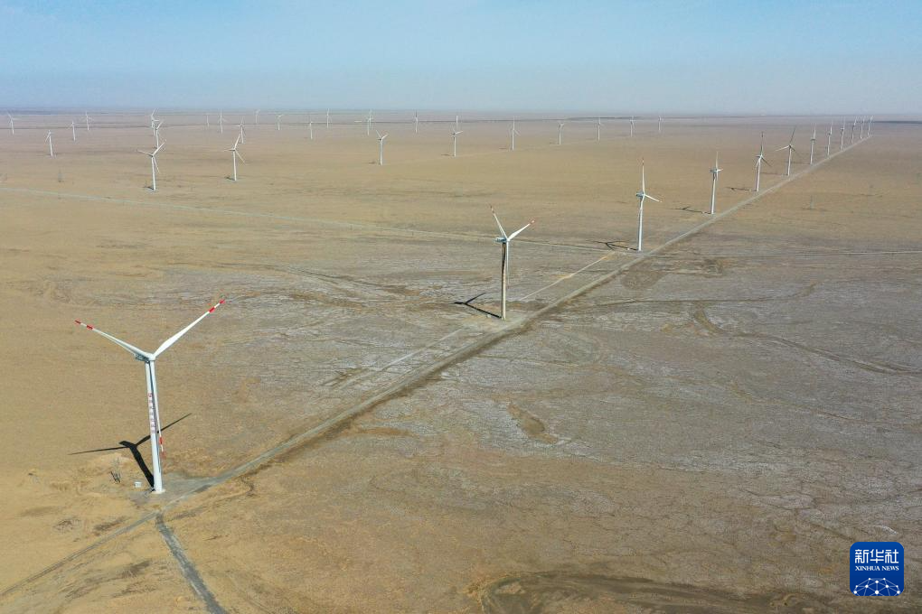 这是在新疆巴音郭楞蒙古自治州若羌县拍摄的新天绿色能源股份有限公司新天若羌县罗布庄10万千瓦风电项目(6月27日摄,无人机照片)。