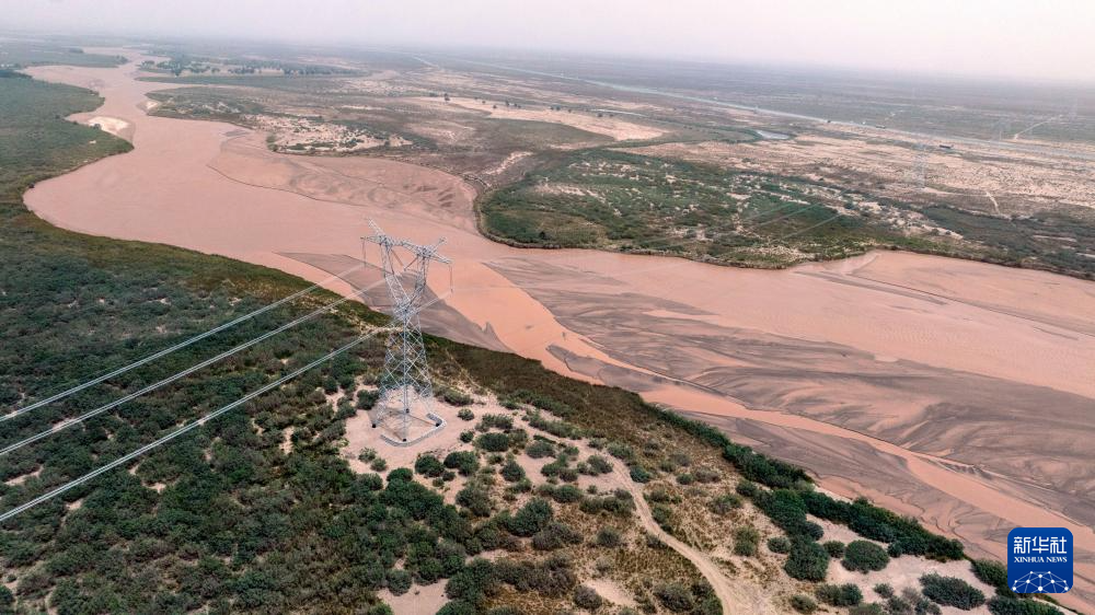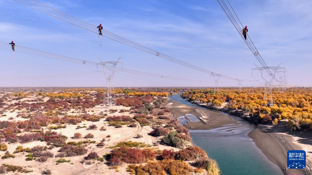 新疆环塔里木盆地750千伏输电线路跨越车尔臣河(6月14日摄)。