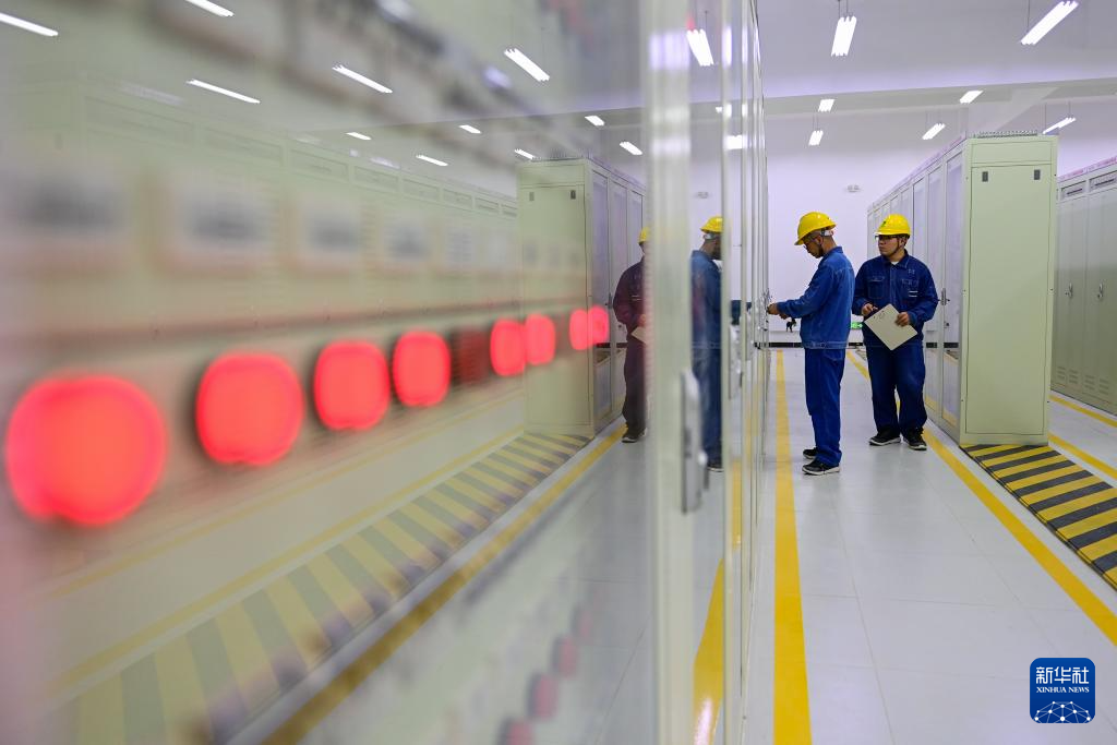 在新疆环塔里木盆地750千伏输变电工程若羌750千伏变电站,运检人员在继电保护室巡检(6月27日摄)。