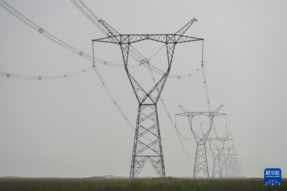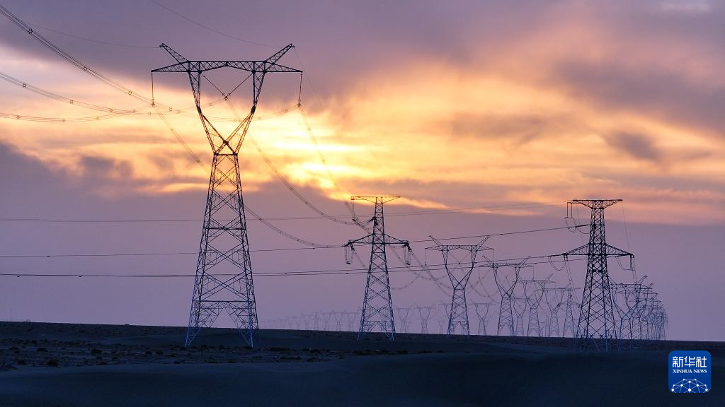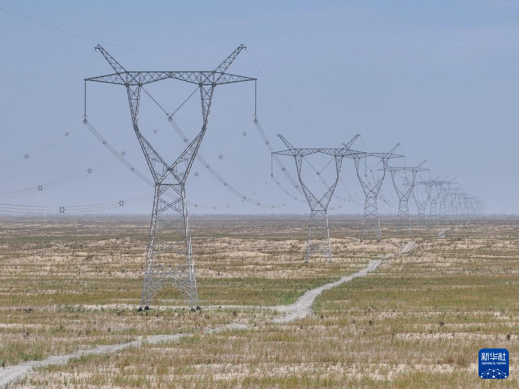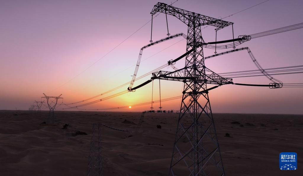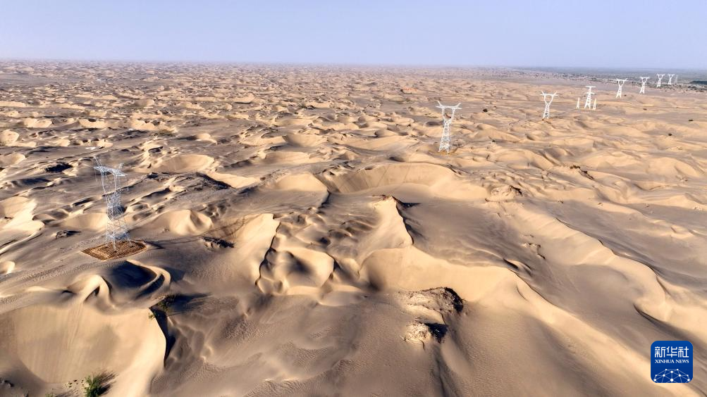 新疆环塔里木盆地750千伏输电线路穿越“死亡之海”塔克拉玛干沙漠(6月25日摄)。