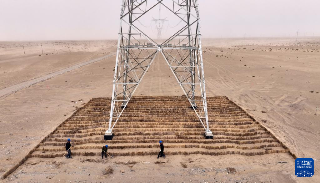 新疆和田地区于田县,施工人员在线路塔基下铺设草方格(4月24日摄)。