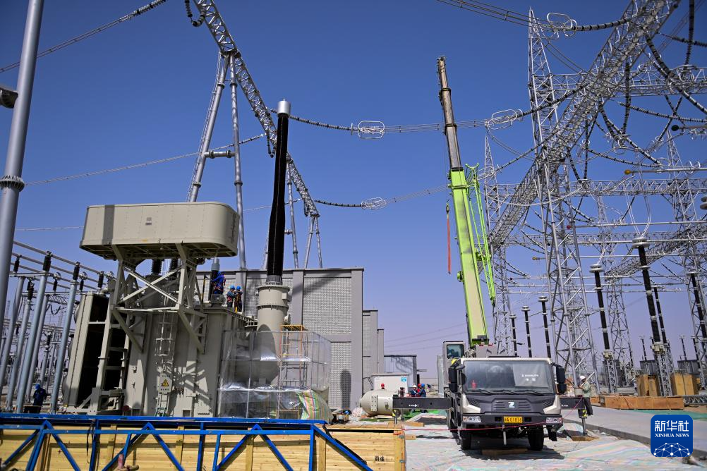 这是建设中的新疆环塔里木盆地750千伏输变电工程且末750千伏变电站(6月25日摄)。