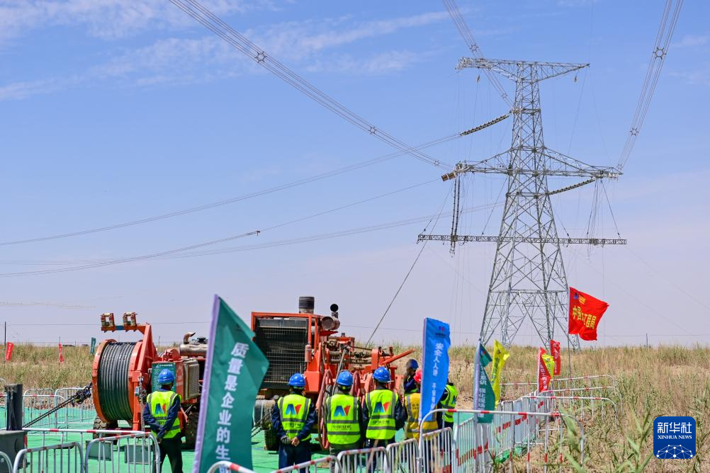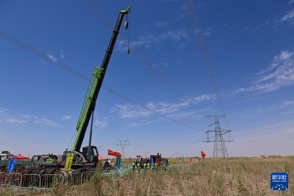 在民丰-且末750千伏线路,作业人员开展紧线作业(7月12日摄)。