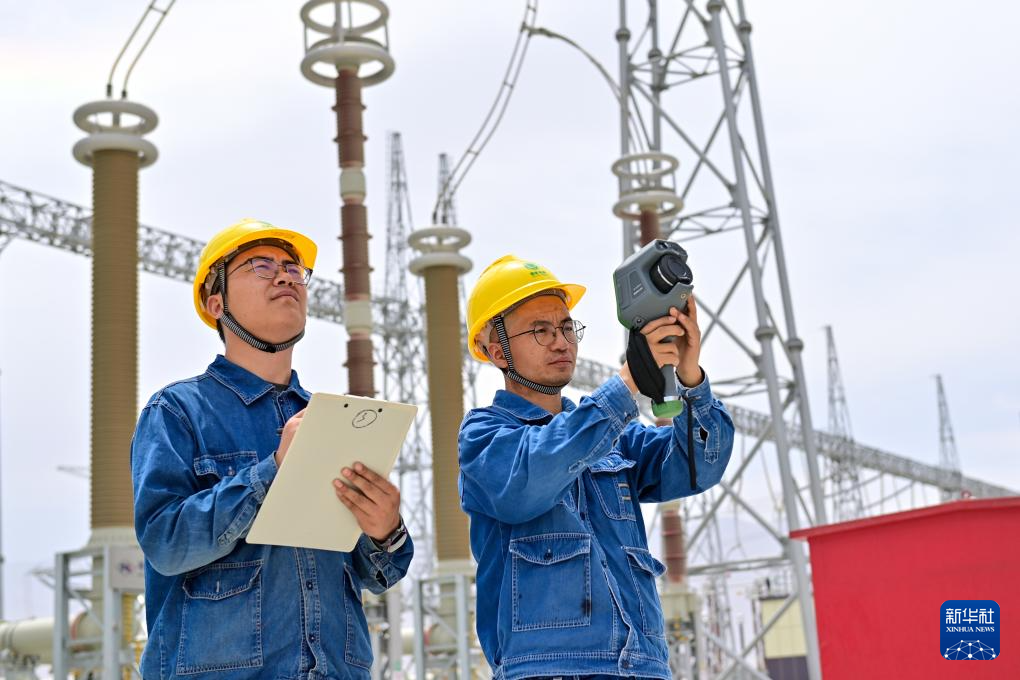 在新疆环塔里木盆地750千伏输变电工程若羌750千伏变电站,运检人员检测设备温度(6月27日摄)。