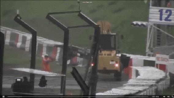 由于雨天溅起的水雾导致能见度几乎为零,加斯利在高速通过一个弯角时,赫然发现一台救援吊车竟然已经进入了赛道,并且就在赛车线上,正准备处理塞恩斯的事故车。加斯利当时以超过 200 KM/H 的速度从吊车旁惊险地擦身而过。