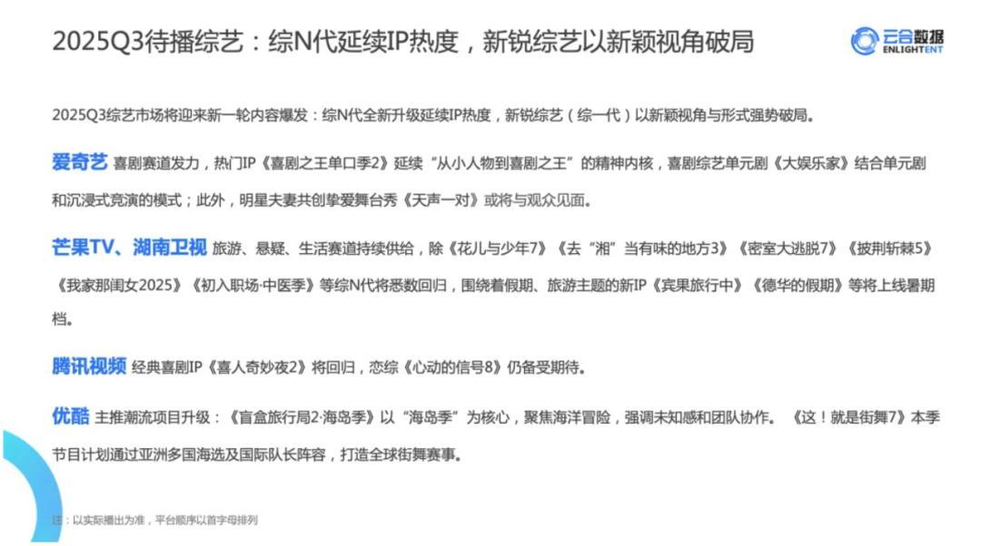 说到这,犀牛君不得不感慨芒果综艺的IP储备之丰,下半年芒果即将推出的项目还有《密室大逃脱7》《披荆斩棘5》《我家那闺女2025》《初入职场·中医季》《再见爱人5》等。芒果综艺的领跑姿态就在于,这些项目绝非其它平台“仅PPT可见”的未落地项目,而是目之所及应该都可顺利上马的IP系列。