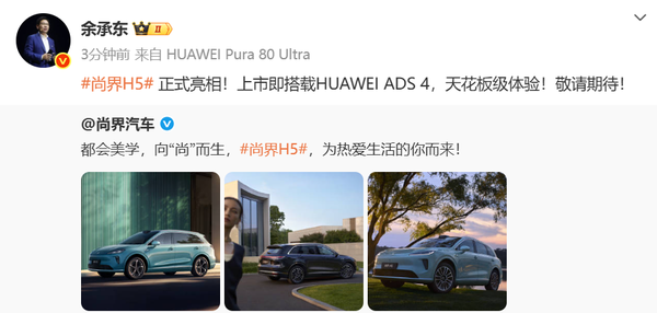 在首次亮相时,尚界简简单单四个字“尚界 上场”,一下就在车圈刷屏,余承东也奔走相告:“今秋敬请期待!智驾好,有蓝灯!”短短12个字,透露了2个尚界的关键信息:上市时间锚定秋季,距离已经不远了,也侧面说明,尚界没打算做期货;将搭载华为高阶智驾,而这一信息也在余承东转发公关照的微博中进一步明晰,尚界将配搭华为ADS 4高阶智驾,拥有尊界S800、问界M9同款192线束激光雷达!