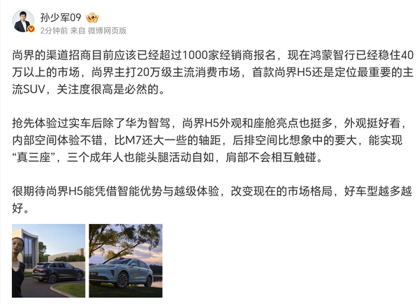 鸿蒙智行最年轻的一“界”——尚界的节奏确确实实非常快。品牌首款SUV在7月11日发布首张概念海报,紧随其后在7月13日,实车公关照也迎来正式发布,一并而来的还有新车名称:尚界H5,鸿蒙智行家族全新5系车型已箭在弦上。