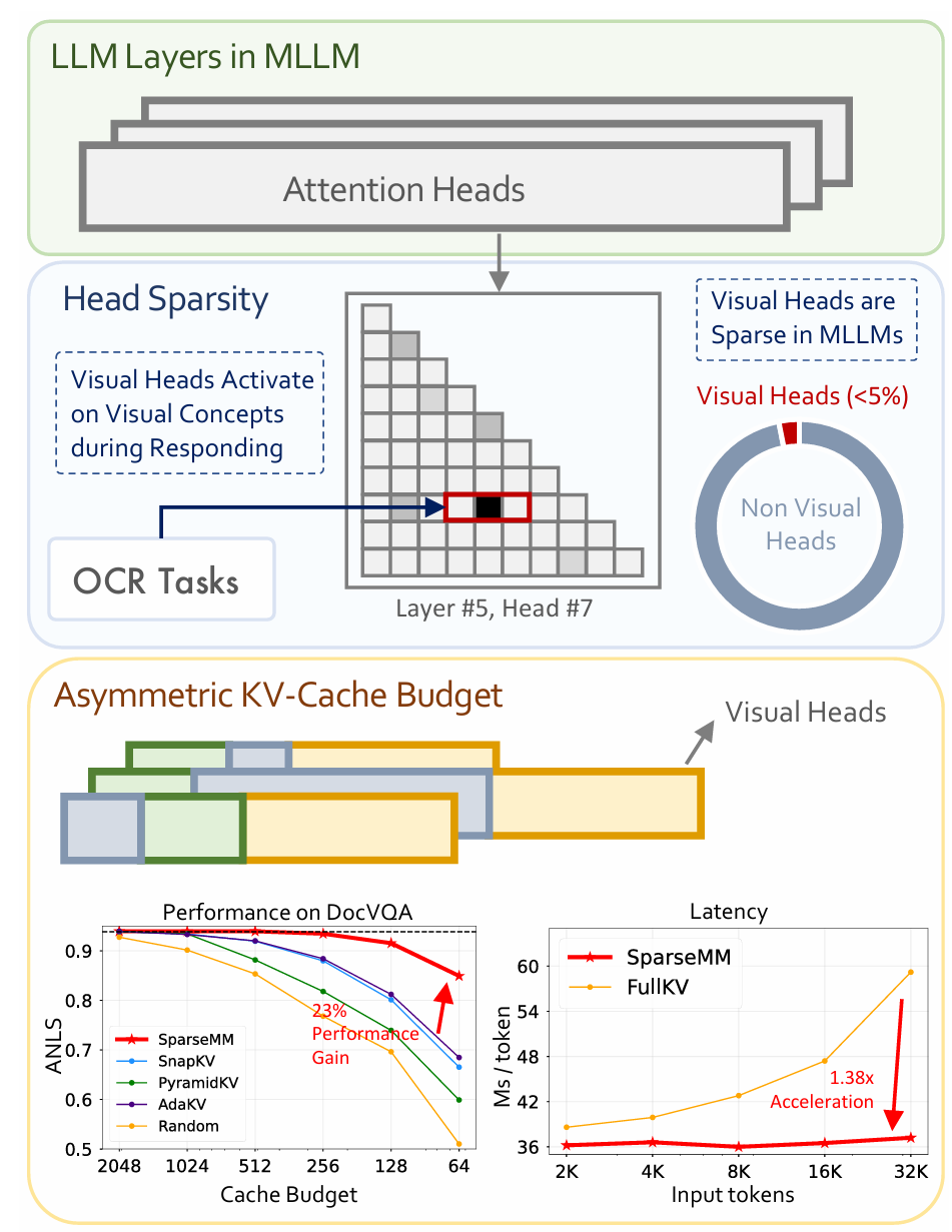 我们提出了 SparseMM,这是一种基于视觉头的 KV-Cache 缓存压缩方法。我们通过在 OCR 任务中精确识别出对视觉信息最敏感的注意力头,并据此设计差异化的缓存分配策略,在保证模型性能的同时显著降低了推理阶段的计算和内存开销。