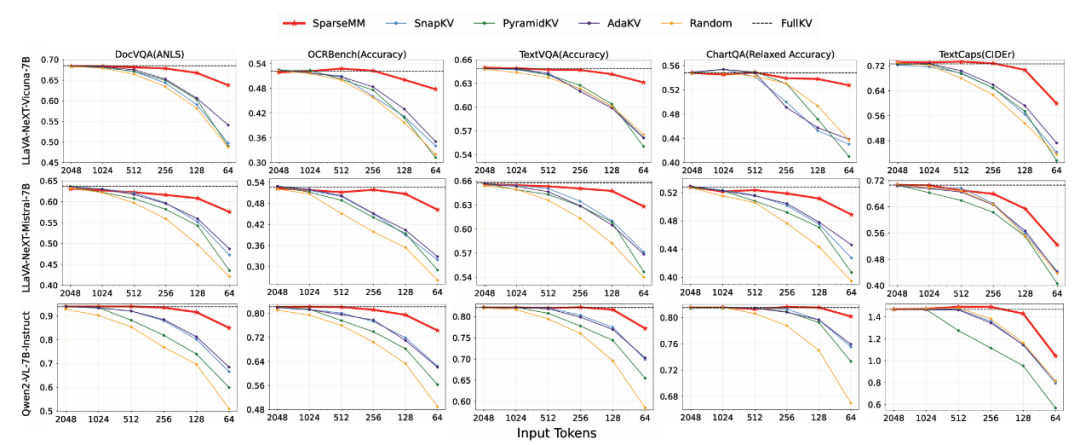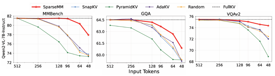 这种差异化的缓存压缩策略在不显著牺牲模型性能的情况下,显著减少了整体 KV-Cache 的内存使用。尤其在视觉 token 占比较高的输入场景中,SparseMM 能够更合理地分配资源,把计算和存储集中在真正重要的视觉内容上。