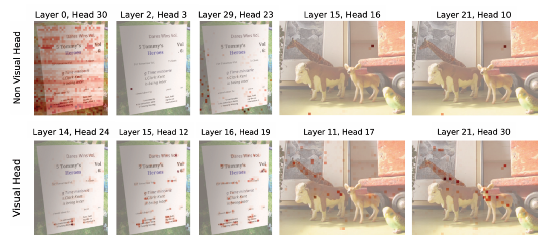 我们可视化了 LLaVA-NeXT-Vicuna-7B 中识别到的一些视觉头和非视觉头,可以看出视觉头能准确的定位到图中的物体或文字,而非视觉头往往不关注图像信息或者关注到错误的区域,这直观地体现了视觉头和非视觉头的差异性。