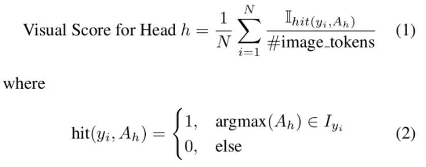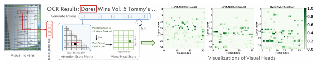 对前序所有输入 token 的注意力得分,若得分最高的 token 恰好属于该字符在图像中对应区域的视觉 token,则认为该注意力头在该位置成功「命中」了对应的视觉内容。每当发生一次「命中」,便为该注意力头累计一次视觉得分。通过统计和归一化所有字符令牌的命中情况,最终可以量化每个注意力头对视觉内容的关注程度,从而揭示模型在视觉信息处理过程中的内部机制。