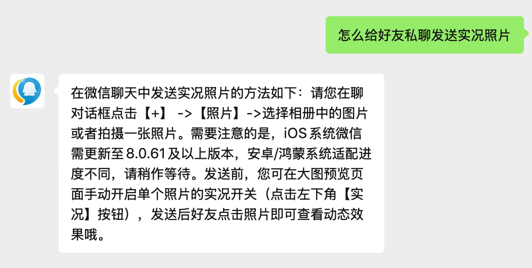 目前聊天发送实况照片功能依旧处于灰度测试状态,我,包括旁边的同事都还没被灰度到,就不给大伙实测了。