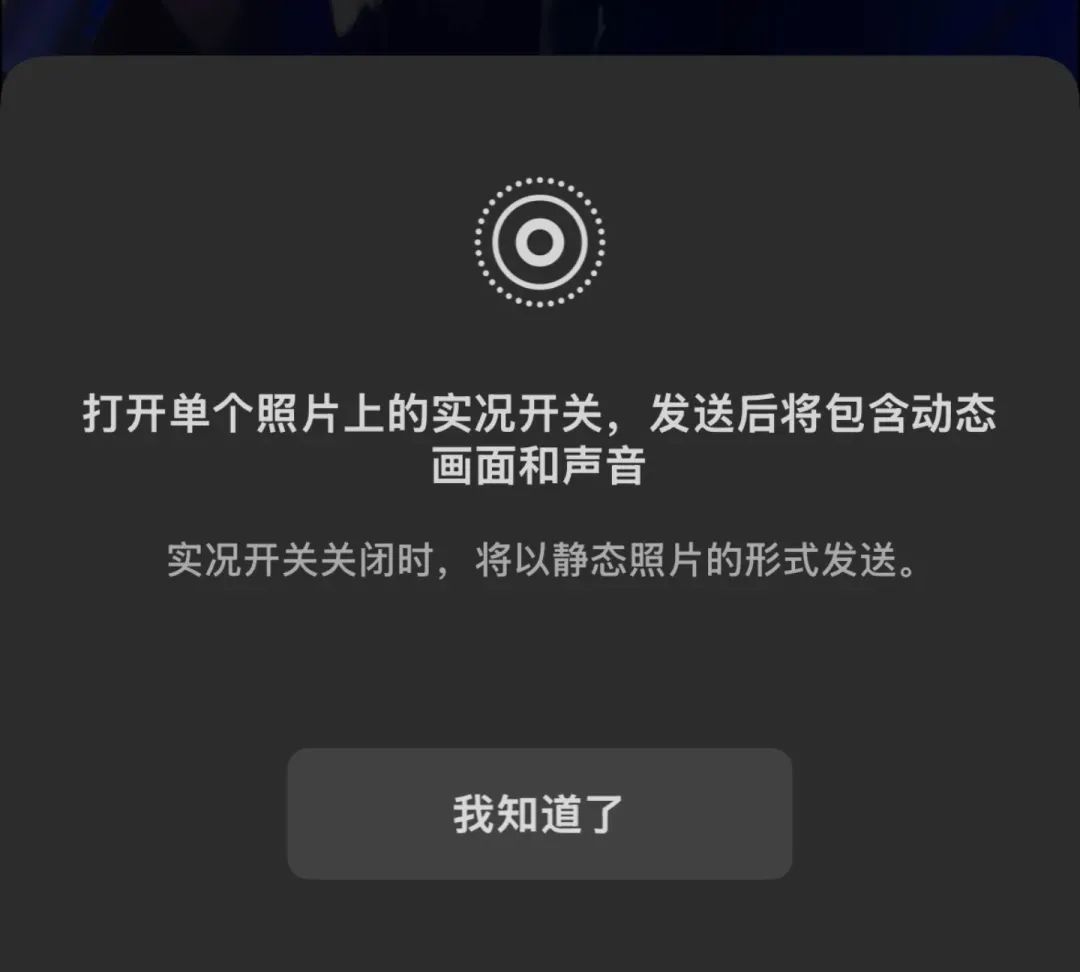 ③实况默认是关闭的,需要的话,可在发送照片时进入大图预览页面手动开启,所以不懂担心手滑;