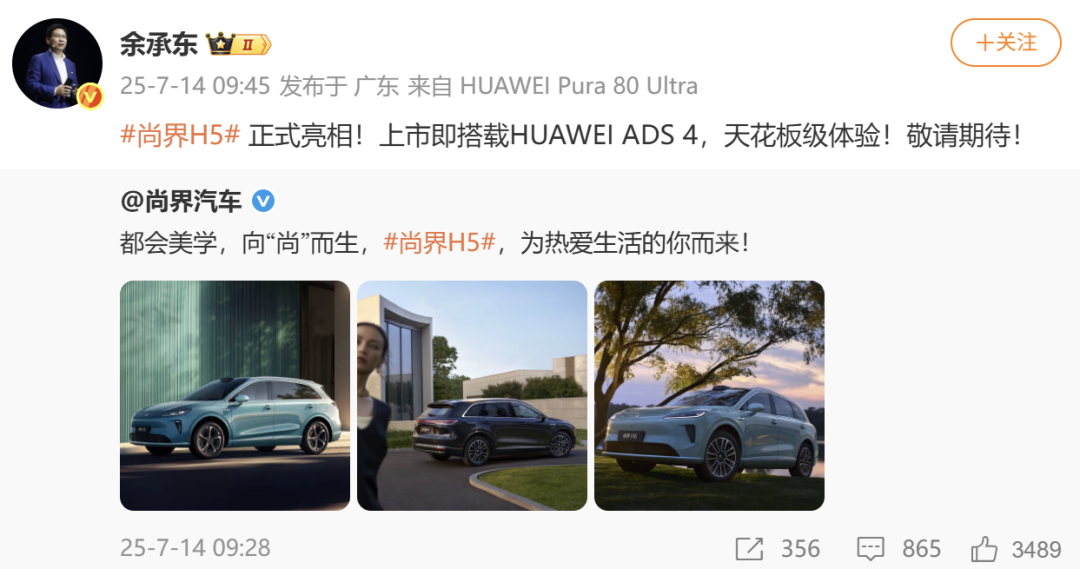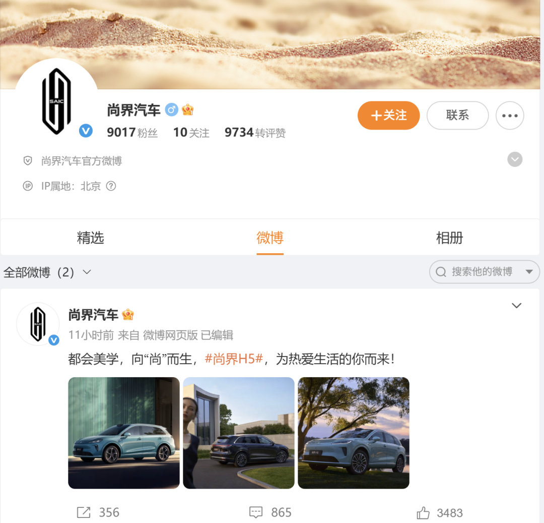 7月14日,尚界汽车首款车型——尚界H5官图正式发布。这是继6月30日“尚界汽车”微博正式注册上线以来,尚界汽车发布的第二条博文。目前尚界汽车微博已认证为“尚界汽车官方微博”,IP属地为北京。半个月时间过去,尚界汽车微博账号粉丝数量已突破9000。