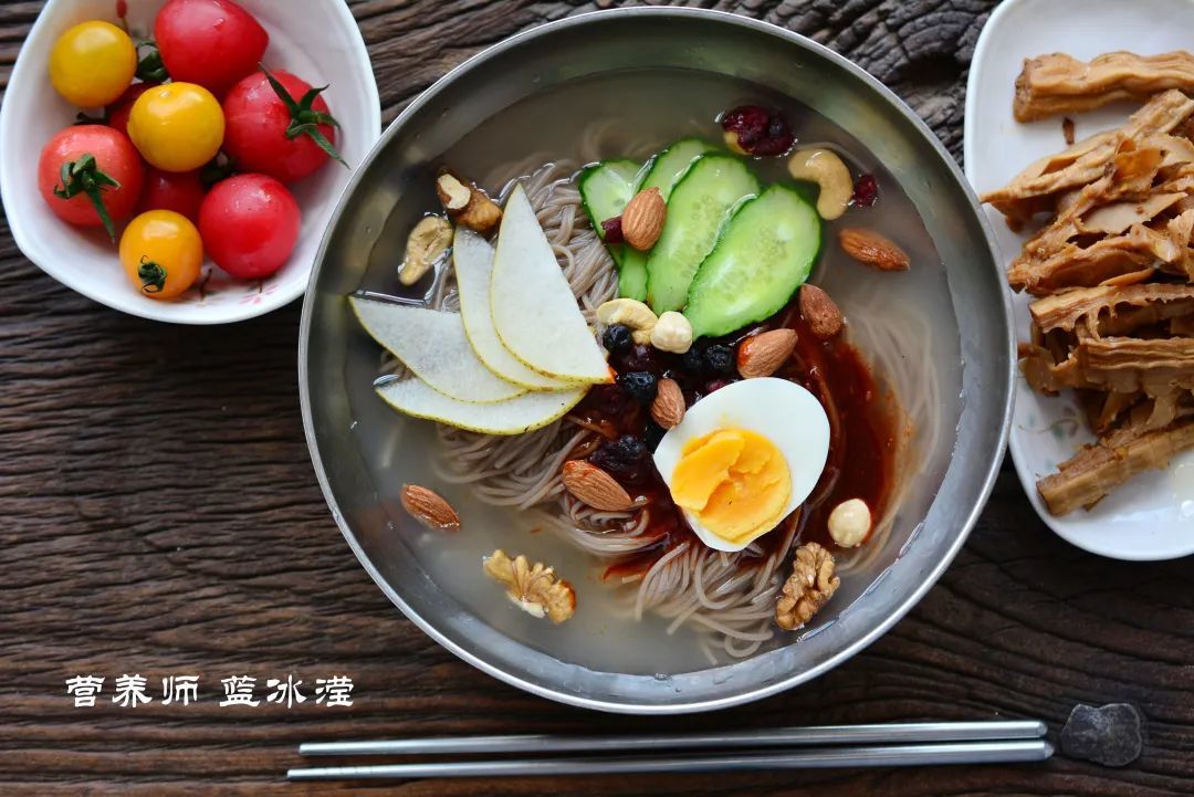 最后补充营养小TIP,就是在冷面中可以适当的增加一些坚果,从营养成分来看,坚果的脂肪含量一般为35%~80%,所含的脂肪酸以不饱和脂肪酸为主,而不饱和脂肪酸是更健康的脂肪酸。当然,坚果虽好,但是毕竟脂肪含量还是很高的,所以吃的时候要控制好量哦~