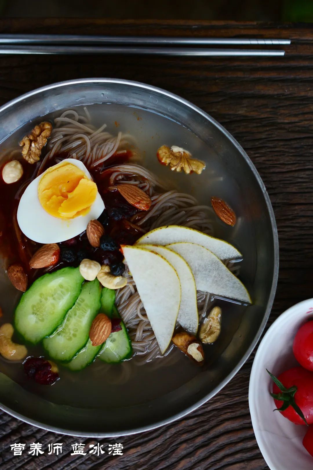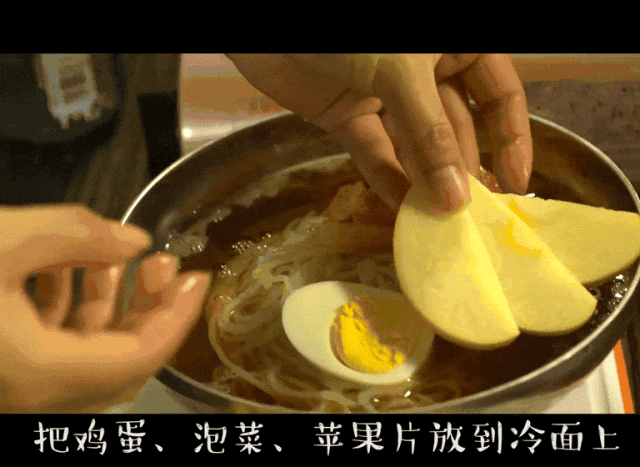 3,把鸡蛋、泡菜、苹果片放到冷面上,最后撒上坚果即可