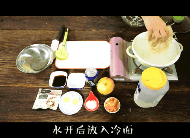 冷面200g,白醋20g,生抽5g,砂糖5g,雪碧一罐,盐2g,辣白菜30g,苹果2片,芝麻适量,煮鸡蛋1个,坚果适量