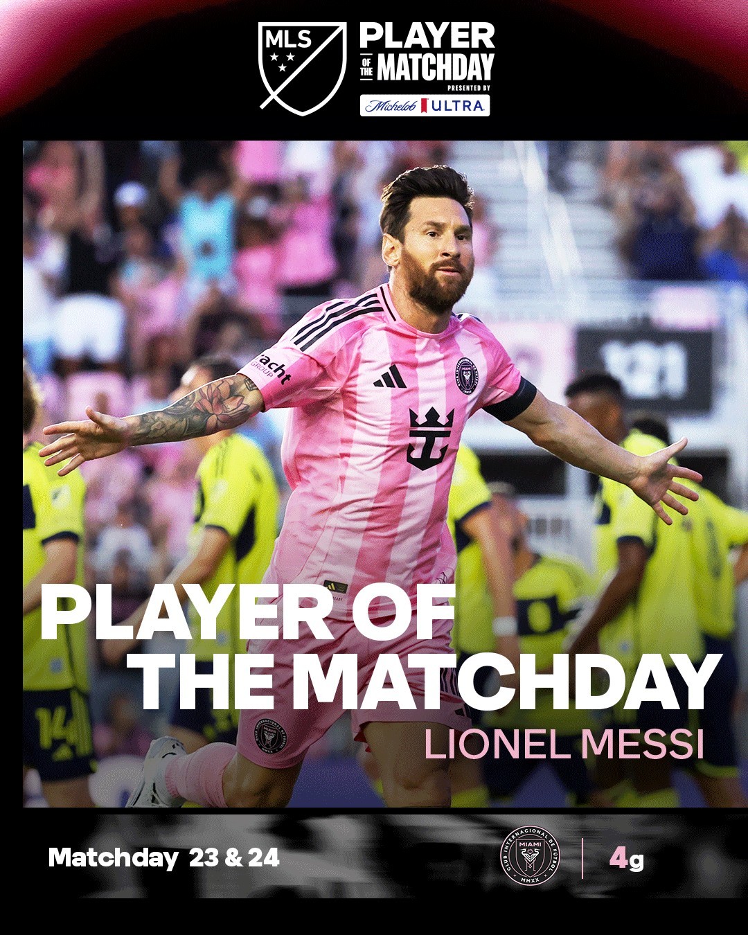 官方消息,迈阿密国际当家球星梅西当选美职联常规赛第23轮及第24轮最佳球员。