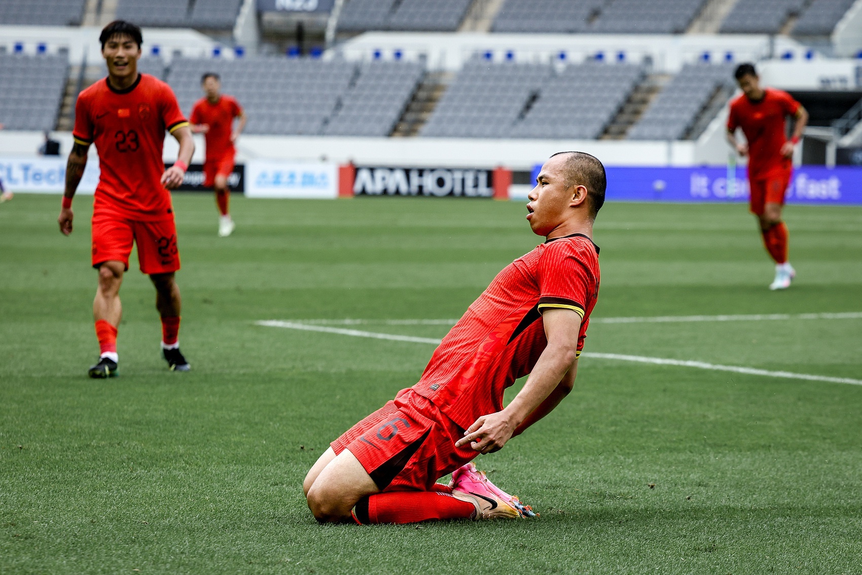黄政宇进球后滑轨庆祝。图/VCG
