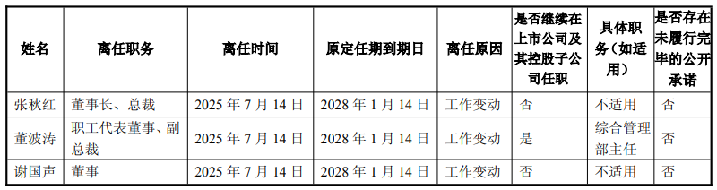 根据《公司章程》规定,公司董事会共由 5 名董事组成,张秋红女士、谢国声先生辞职导致公司董事人数低于《公司章程》规定。为了确保董事会的正常运作,张秋红女士将继续履行董事长/法定代表人、战略委员会委员(召集人)、薪酬与考核委员会委员职责,谢国声先生将继续履行董事、审计委员会委员职责,至新任董事通过股东会审议之日止。