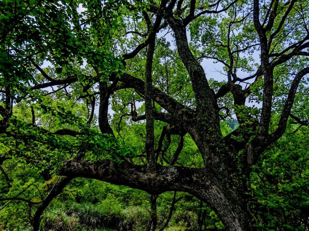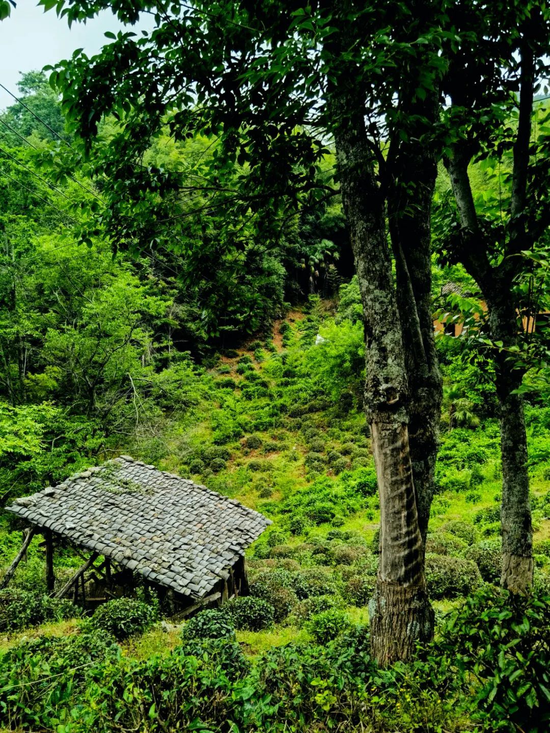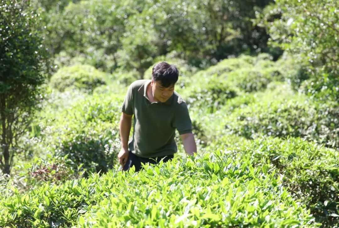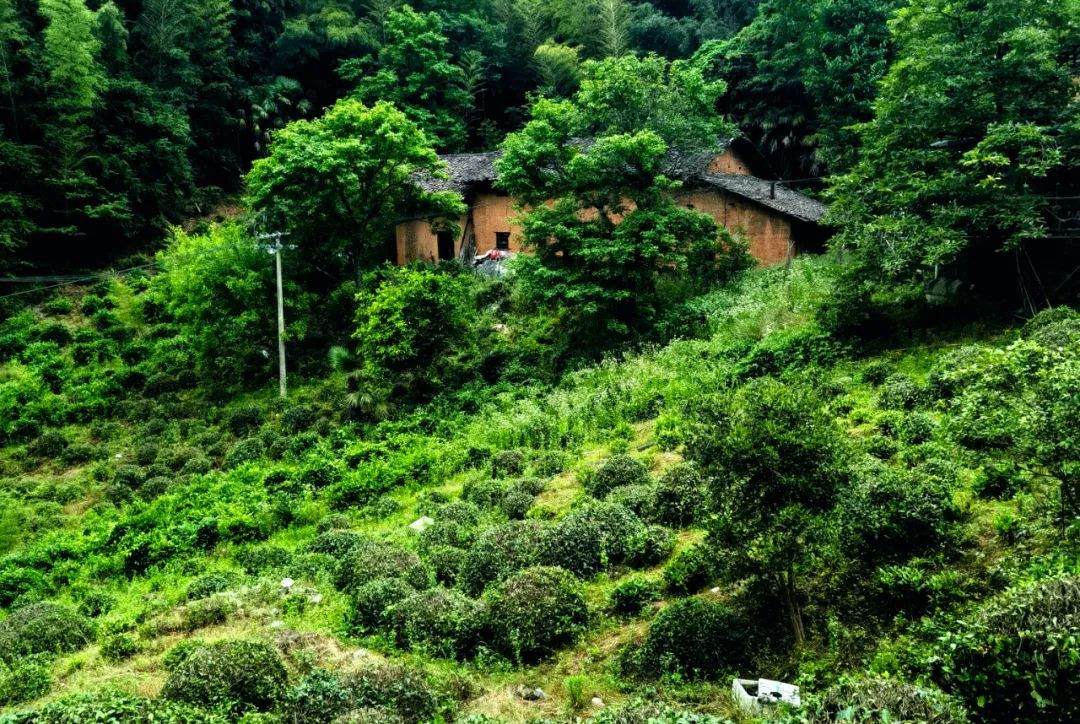 及至内屋基,但见古木参天,浓荫蔽日,山泉淙淙穿行石间,偶有猿啼鸟鸣,更添几分野趣。此地原住六户人家,今已迁至山下,唯采茶时节仍回山居住。茶树不似寻常茶园那般整齐划一,而是零星分布于海拔八百至一千米的高山斜坡上,每片茶场或几十株,或数百株,皆被竹林树木环抱。