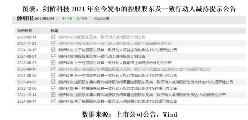 除了核心员工纷纷减持套现,时代商业研究院梳理历史公告发现,2021—2024年,剑桥科技先后七次发布控股股东及其一致行动人减持股份比例达1%的减持结果公告。