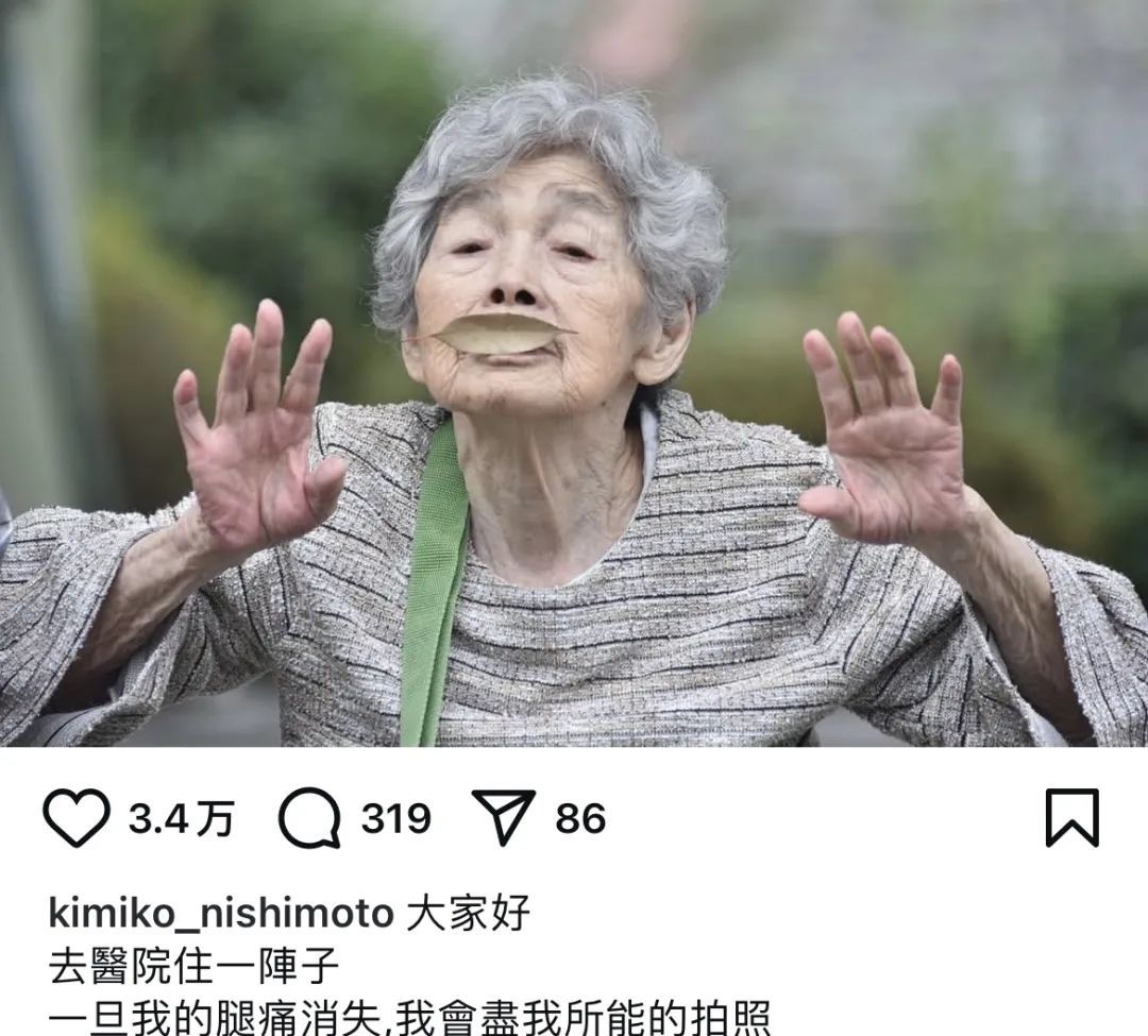 今年5月,喜美子奶奶身体状状况急转直下,她在IG上说自己要去医院住一段时间,还配了一张咬住树叶的搞怪照片。