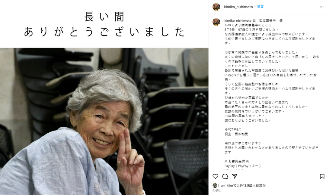 6月9日,日本人气摄影师西本喜美子在家中安静地离世,享年97岁。