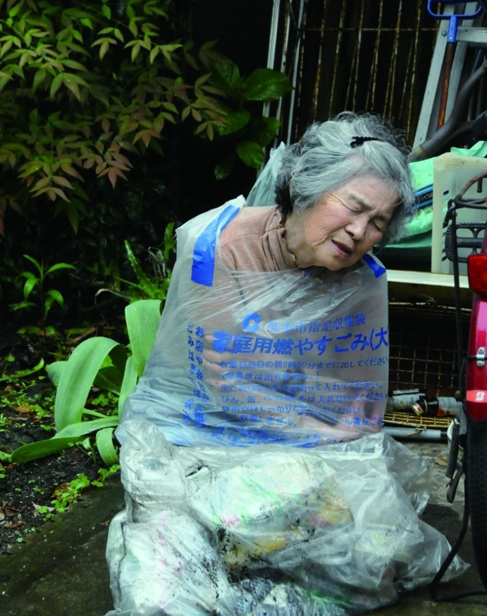 又或者把自己塞入垃圾袋,隐喻日本老年人困境话题的。