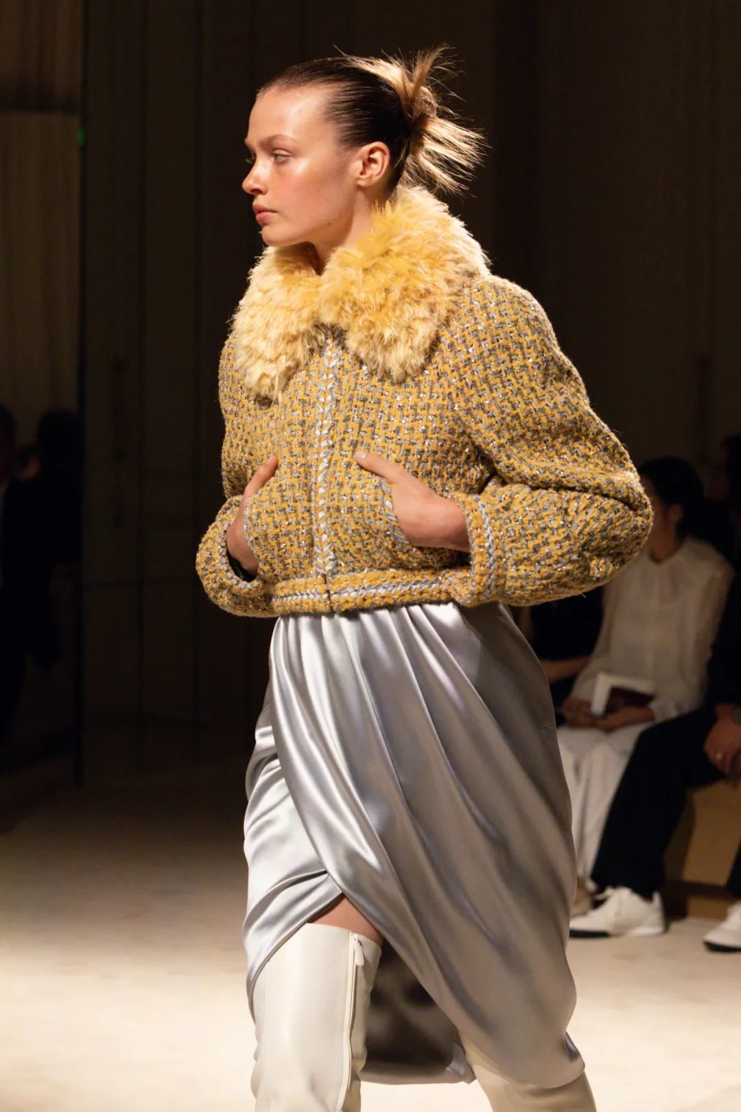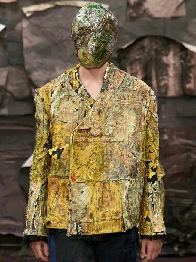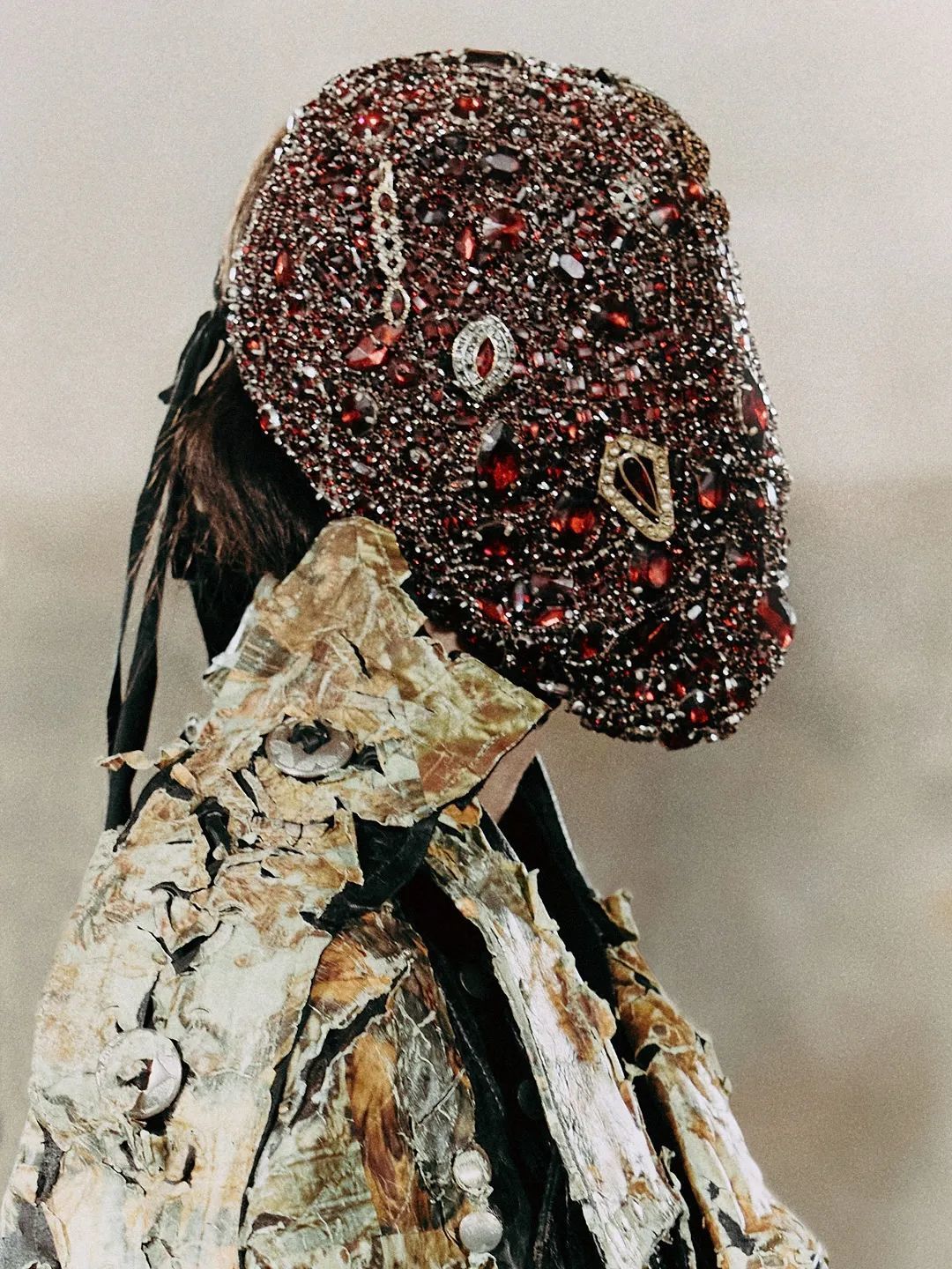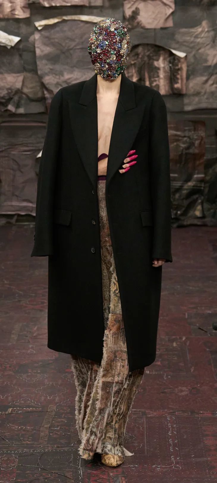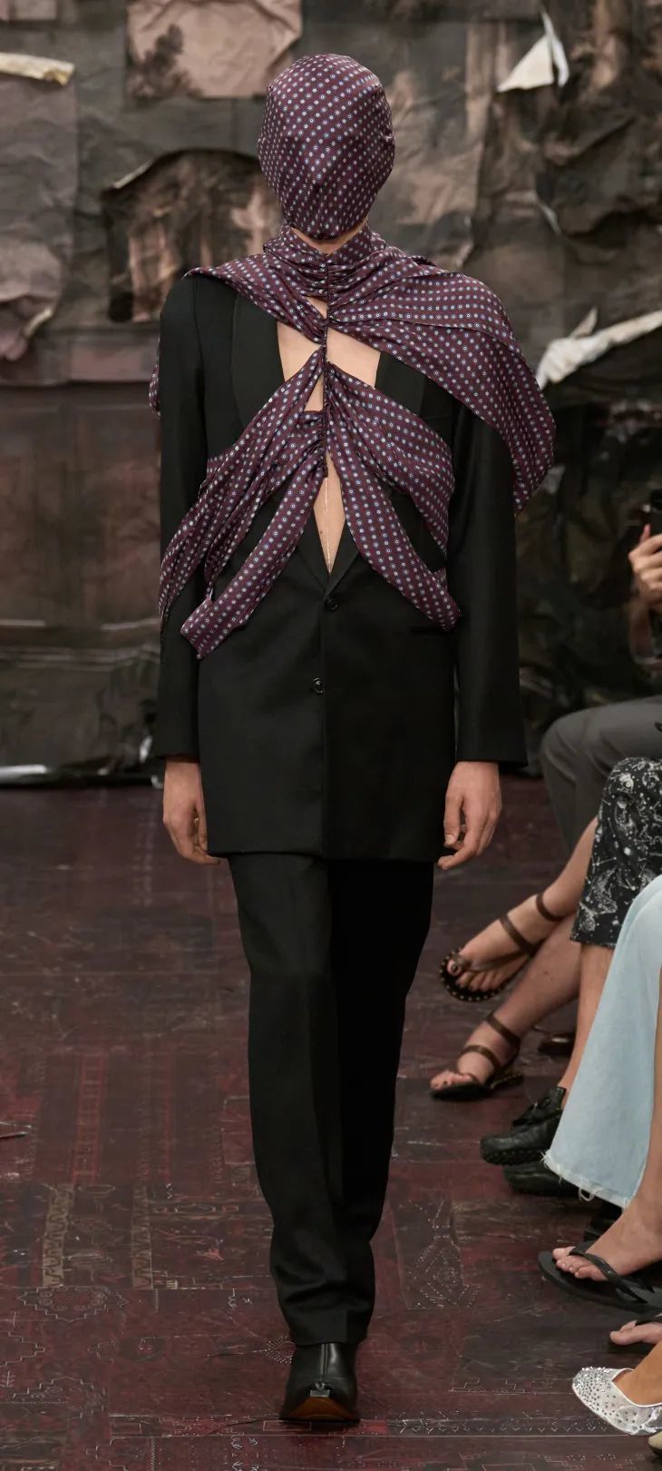 模特们戴着面具,召唤着Martin Margiela的幽灵。当年,Martin Margiela为了缩减模特肖像成本而发明了这种方法,而后这成为了Maison Margiela的品牌「签名」,被Matthieu Blazy、Ye、Demna等创作者致敬并再创作,用这种「匿名性」去突出创作本身。