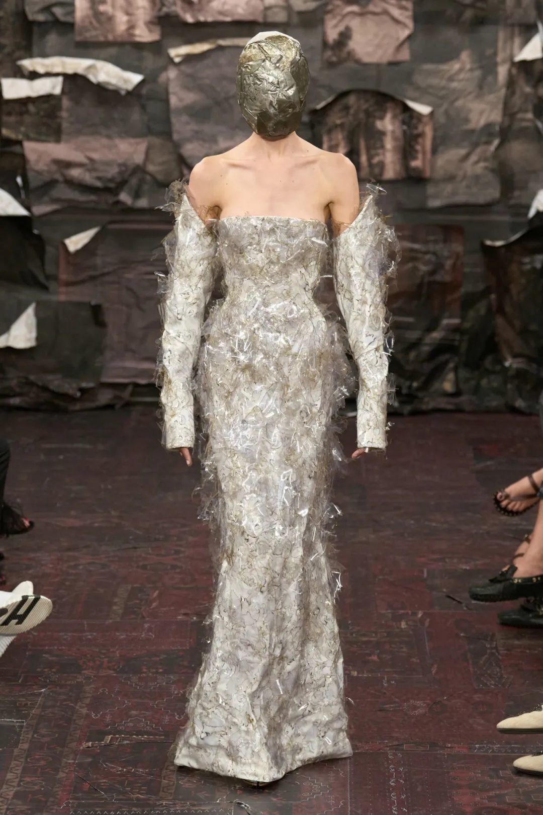 相比他的前任John Galliano,Martens的手法显得颇为粗野(brut),但更接近Martin的趣味。在这个以面料造价与工时评判价值的领域,Glenn Martens则选择践行可持续设计理念,将寻常材料升级再造。他用废弃时装珠宝、普通打印纸、塑料制品、回收利用的衬里面料与皮夹克以及马口铁盒,描绘了一场艺术盛宴:「高级定制的妙处在于它是纯粹的创意实验。」