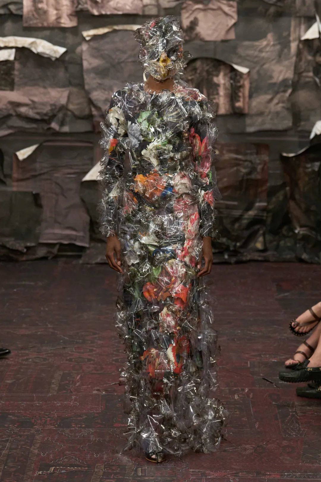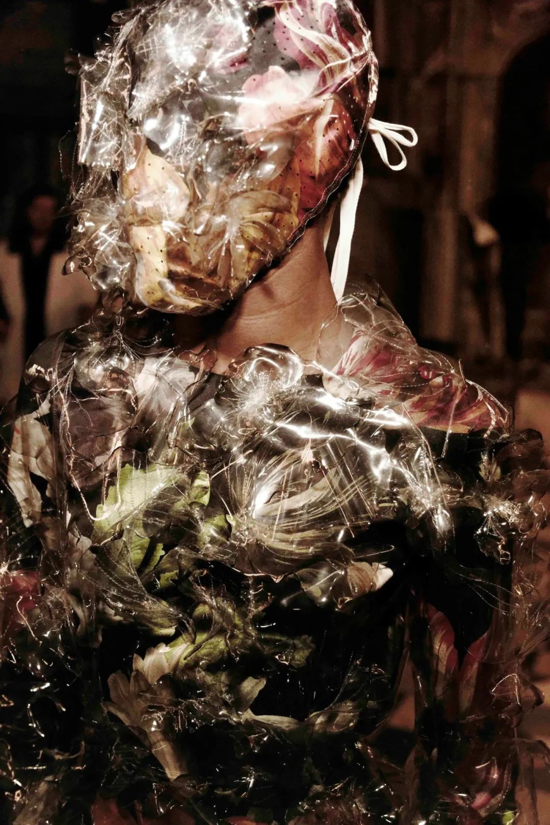 开场的几个造型,那些透明塑料布让人联想起Maison Martin Margiela 1990春夏系列中的「防尘罩」,被束缚双手的造型则直指Maison Martin Margiela 1998秋冬系列里的塑料布缠绕效果。