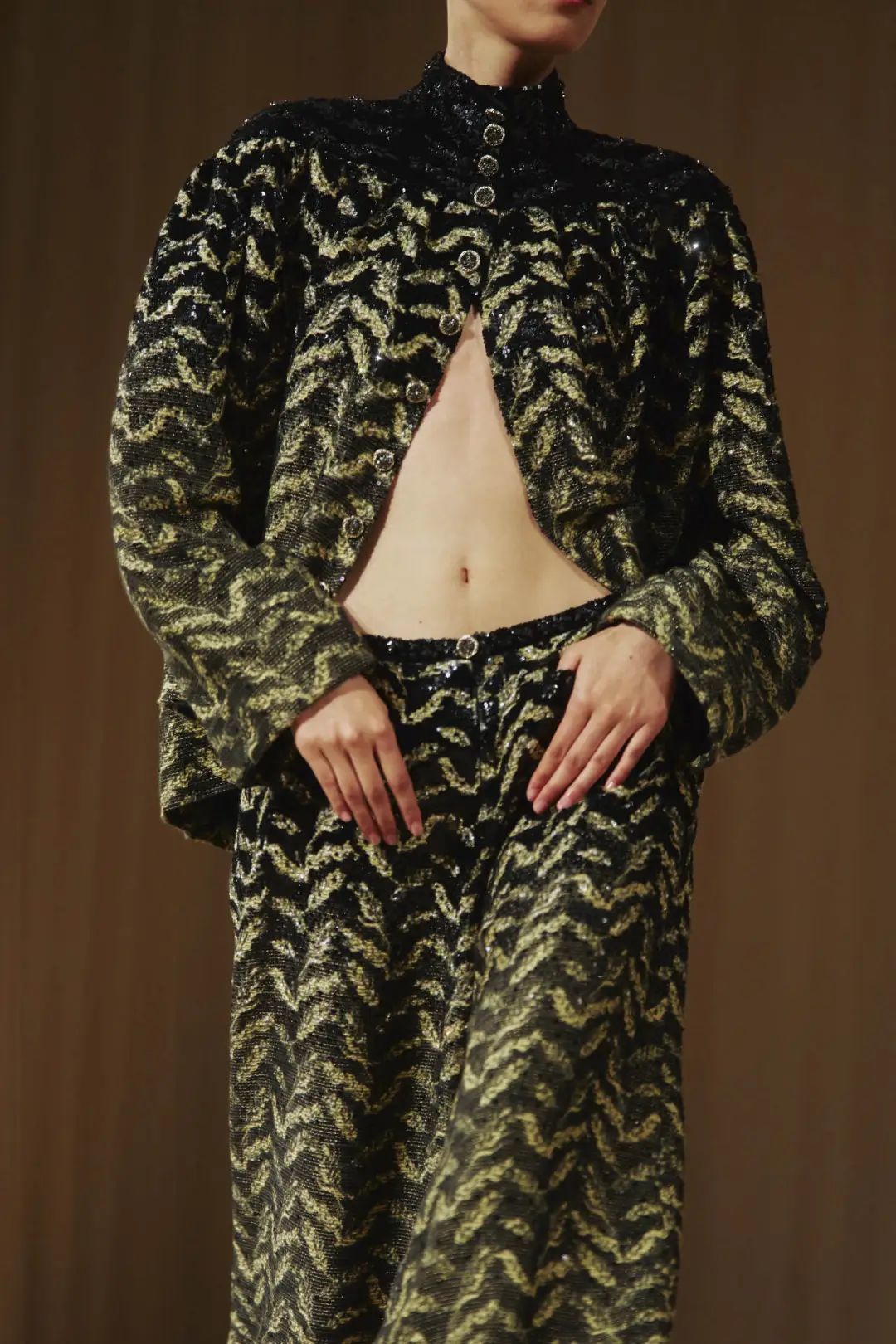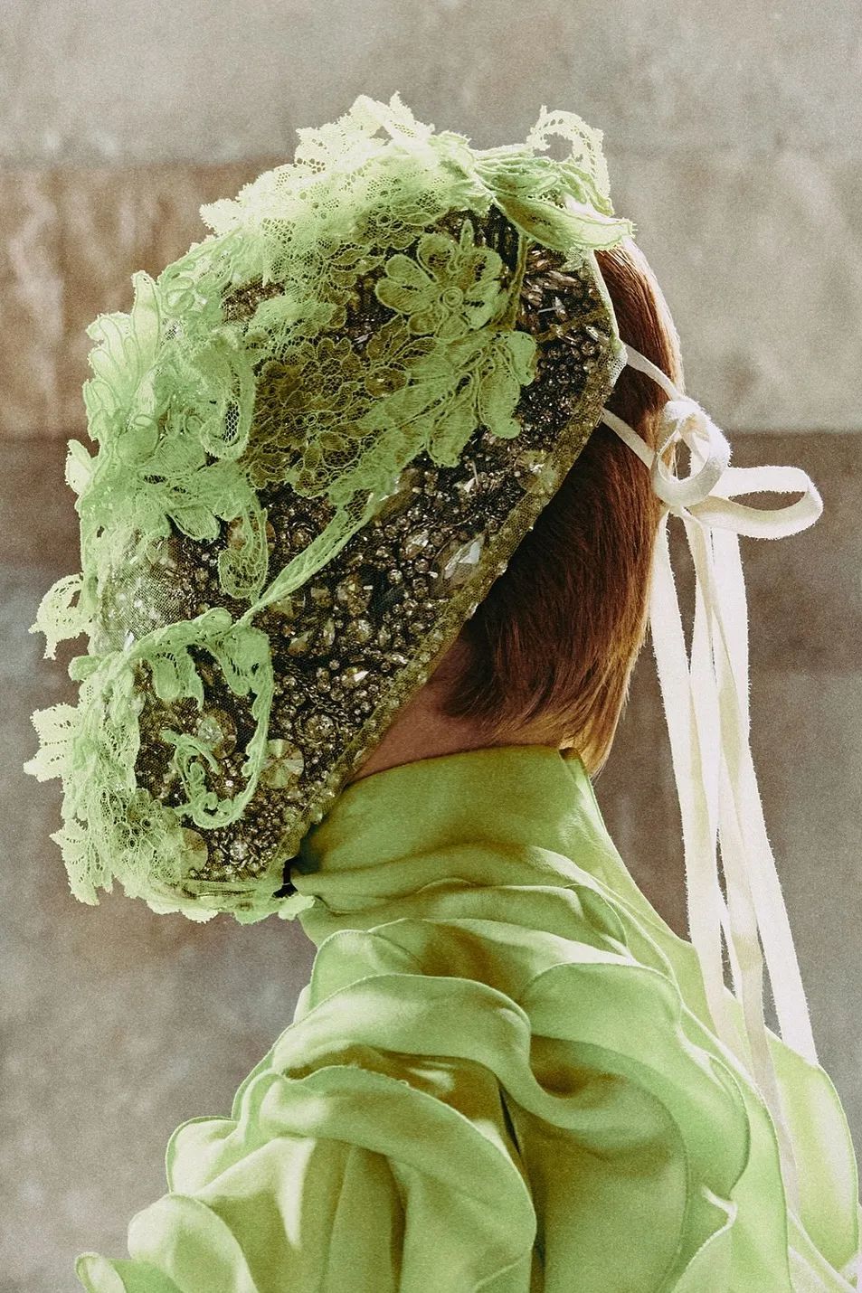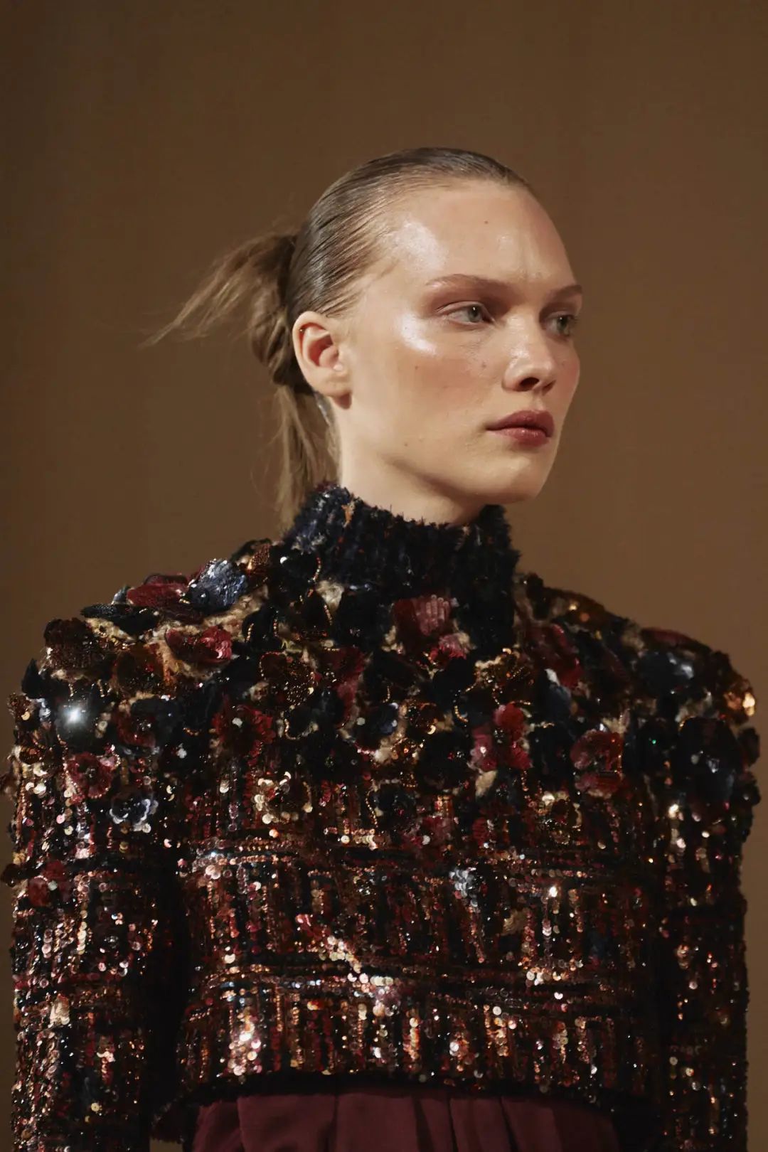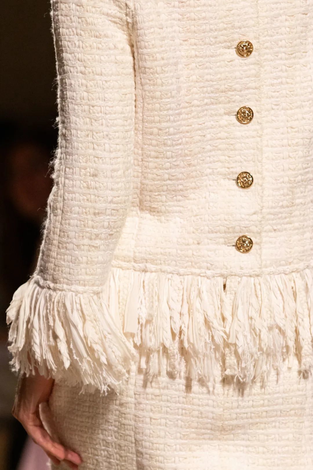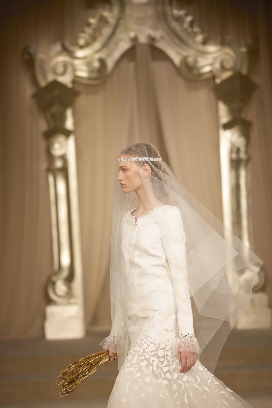 就像上一个成衣系列,以珍珠、蝴蝶结贯穿整个系列。在这场高级定制中,麦穗也起到了同样的作用:或化作羽毛,织入吊带连衣裙的雪纺荷叶边;或化作刺绣,绕于婚纱礼服裙的领口;或排列成人字纹图案,为裤装套装增添一丝诗意;各式各样的珠宝钮扣上浮现出麦穗的轮廓,压轴的婚纱捧花也是一束麦穗。