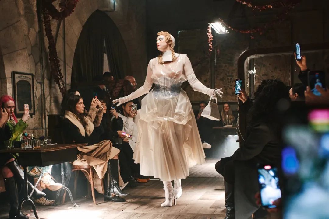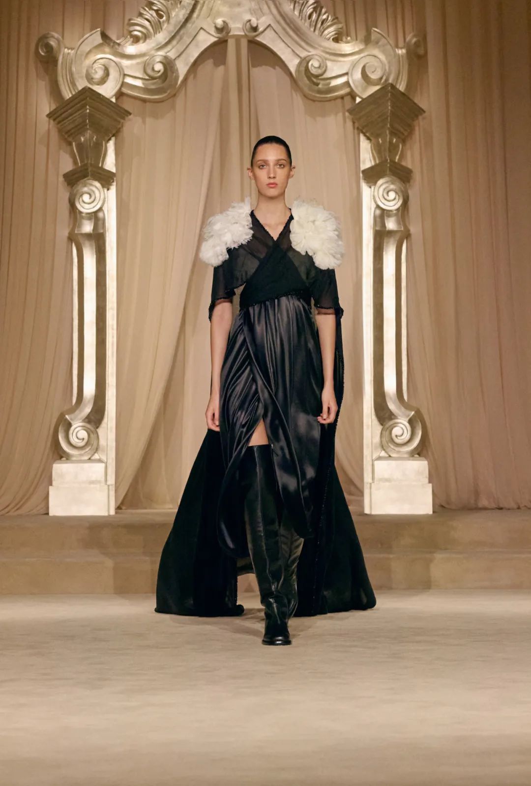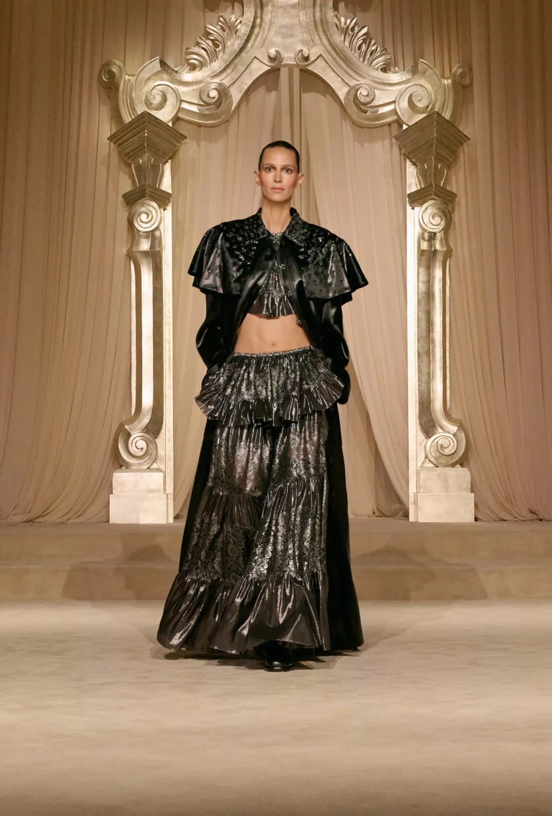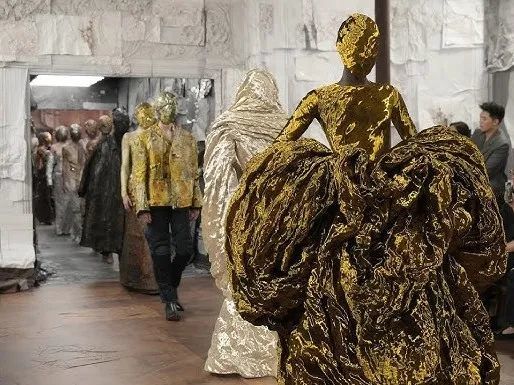 这场秀发布地选在巴黎北部的104艺术中心Le Centquatre。2008年,Martin Margiela曾在这里举行了他最后一场时装秀。Martens重启故地,将空间内覆盖上北欧文艺复兴时期的宫廷室内装饰拼贴画,使之宛如一座哥特宫殿遗迹。这也是这场秀的基调。