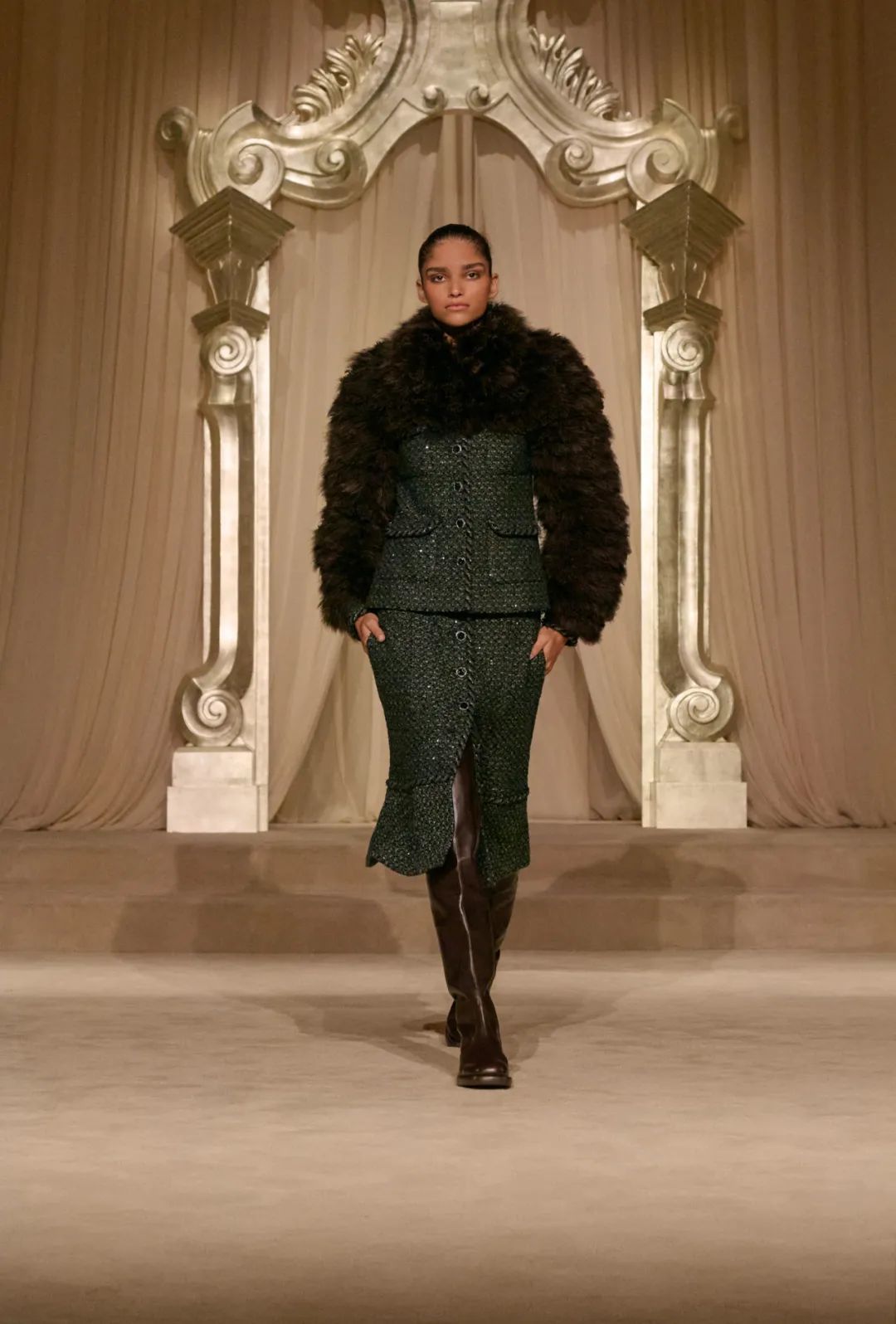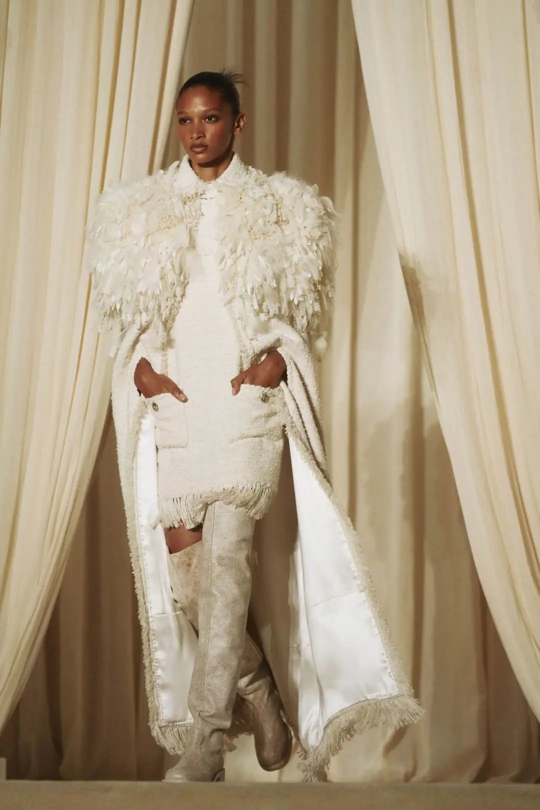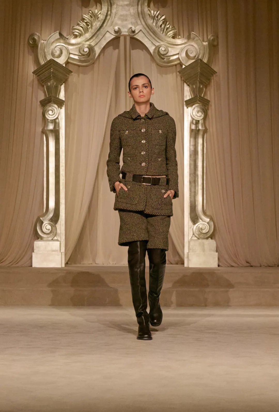 这个系列的剪裁比例借鉴了男装设计理念,为身体赋予行动自如、自由的空间。套装外套化作毛衣款式,马海毛套装分别印染秋意盎然的绿色与紫红色。圈圈呢斜纹软呢营造出绵羊皮般的质感,打造黑白双色直裁大衣式连衣裙、半裙套装与长马甲,以及饰以手绘图案与刺绣的象牙白色短裤。斜纹软呢与羽毛交织,在裤装套装、长款大衣、刺绣斗篷与短款束腰外套上演绎皮草般的幻象视觉效果。每个造型都搭配了一双厚重的长靴。这些元素融合在一起,给CHANEL带来了一丝新鲜感。