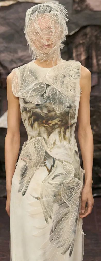 比如将17世纪佛兰芒画家Nicolaes van Veerendael(1640-1691)的花卉静物画印制于塑料或织物表面,经特殊剪裁后转化为立体装饰元素。一些款式中,大理石雕塑的湿褶技法转化为朦胧的透视薄纱,呼应精雕细琢的人体美学。