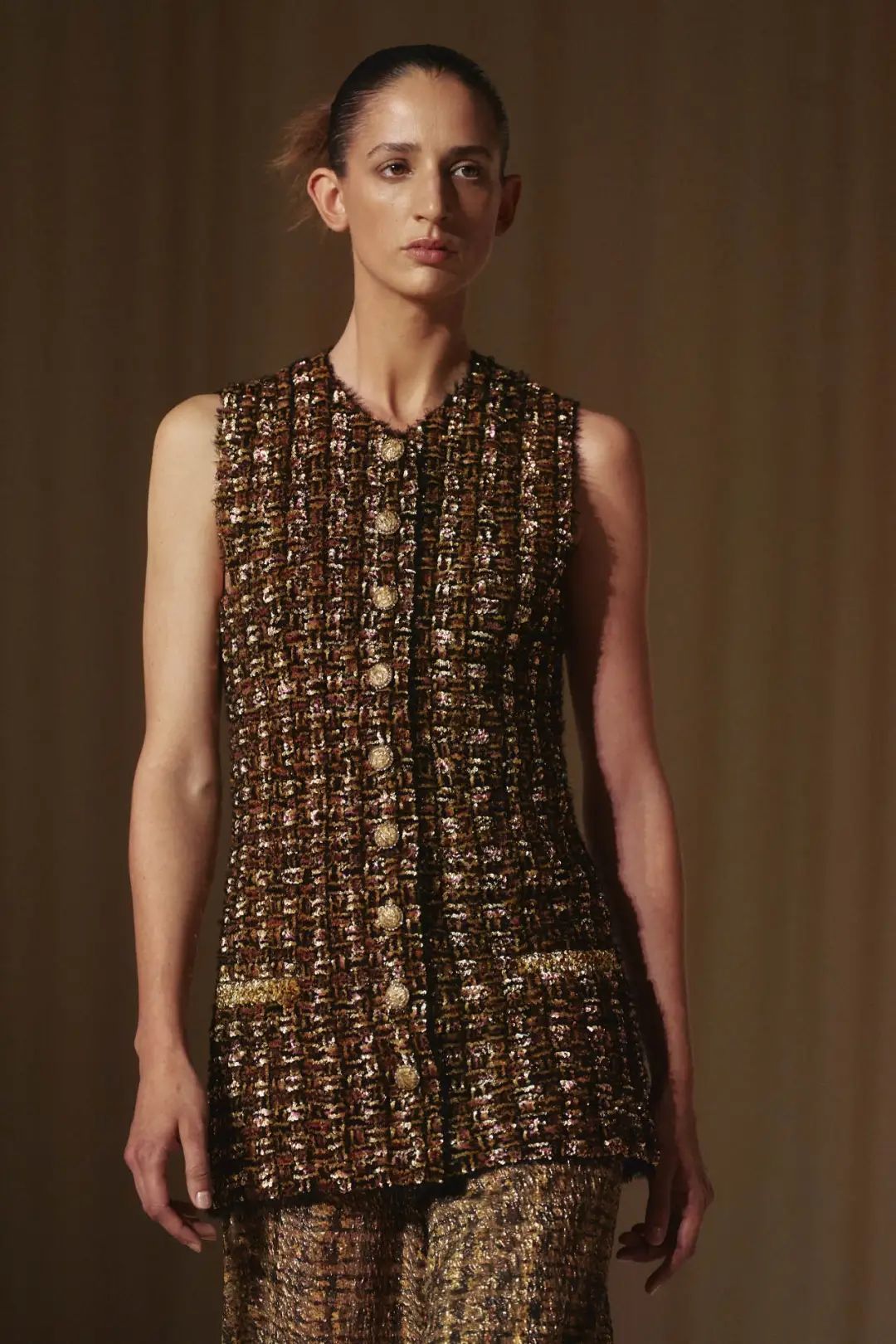 CHANEL精品部创意工作室以乳白色、象牙色、棕色、绿色与黑色等冷静的自然色调作为套装作品的核心色彩。Gabrielle Chanel女士所迷恋的金色麦穗元素贯穿整个系列,象征着丰饶,这也是苏格拉高地的常见农作物。