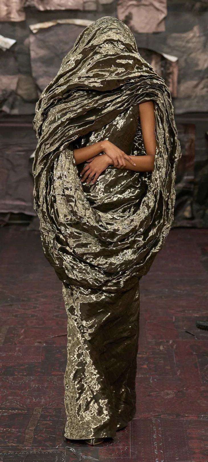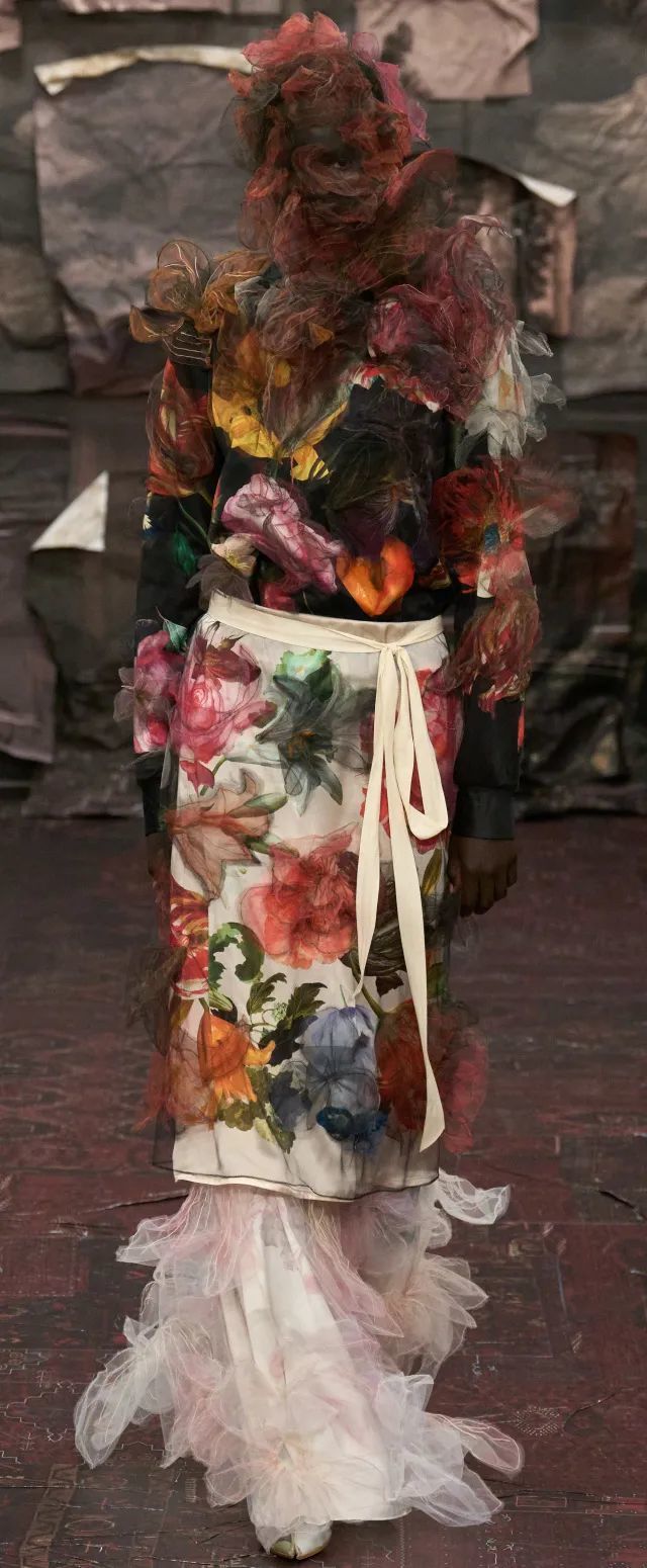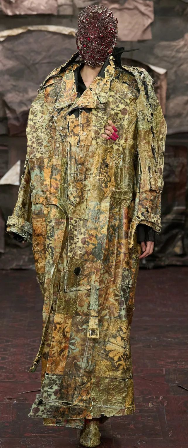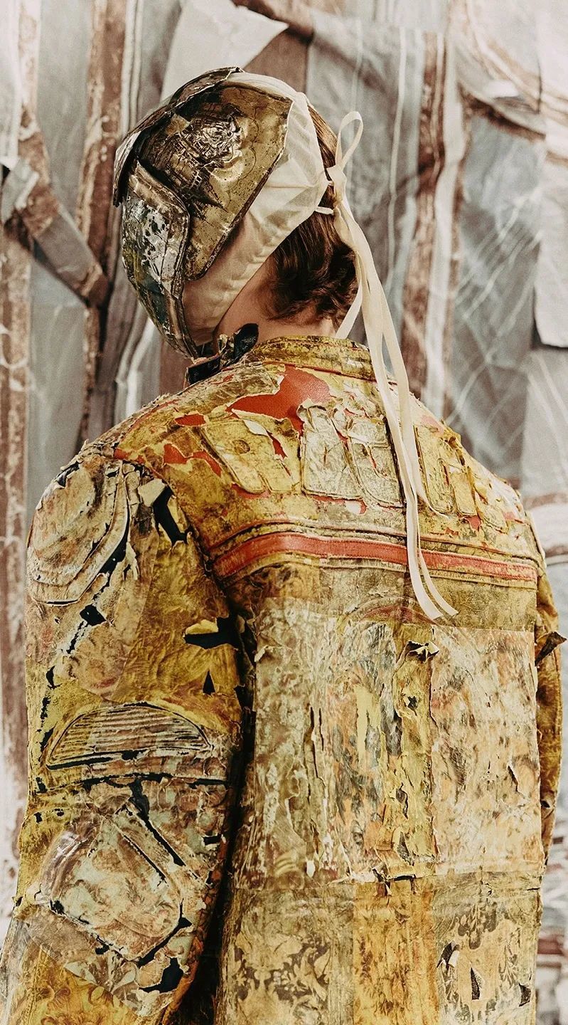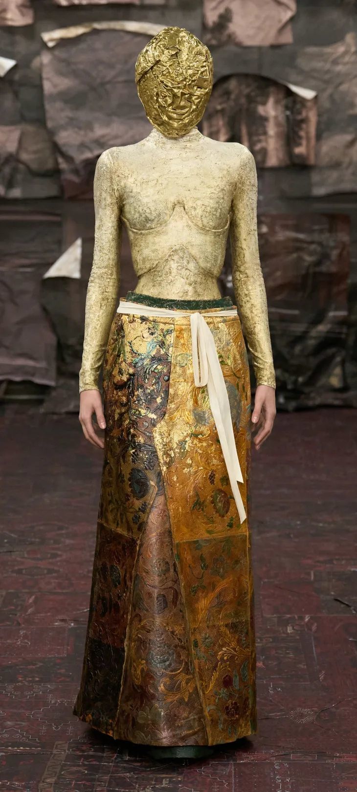 Look13的裙子,表面覆盖着16世纪弗兰芒手绘浮雕花卉皮革壁纸纹样的金箔压花,看上去却与Maison Martin Margiela 1992春夏系列中那些拼布长裙颇为相似。