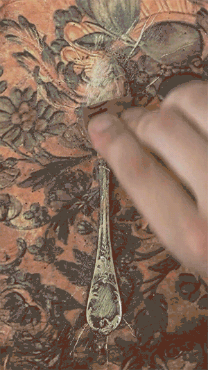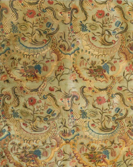16世纪弗兰芒手绘浮雕花卉皮革壁纸纹样经复印技术转印后,同时通过面料印花、皮革压花等工艺重塑面料肌理,或再以特殊金漆技术覆盖,其质感让人想起了19世纪奥地象征主义画家Gustav Klimt的作品。