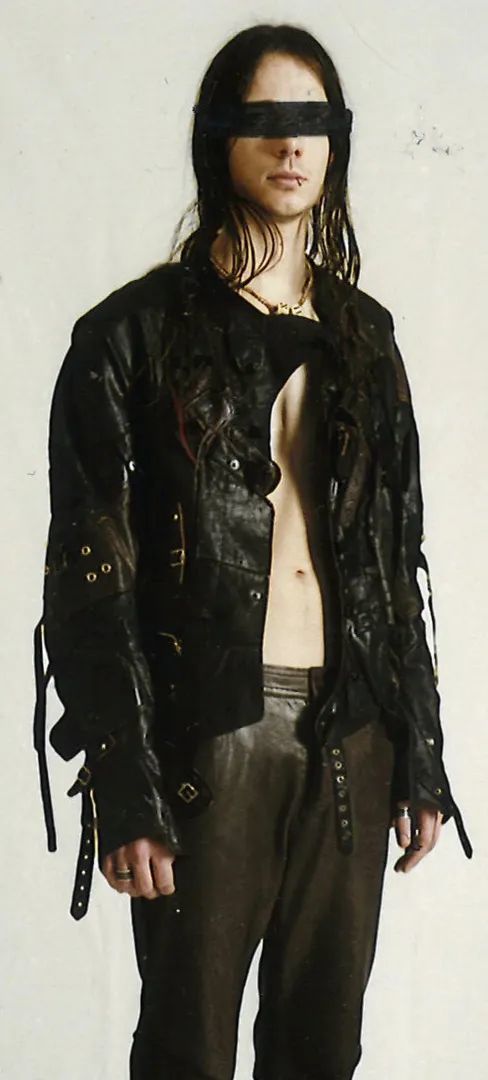 Look16的黑色皮革机车夹克由升级再造的旧夹克拼制,这套技法致敬了Maison Martin Margiela 2005秋冬男装的设计。Glenn Martens为其增加了一层覆有棕色及黑色色调的16世纪弗兰芒手绘浮雕花卉皮革壁纸纹样的肌理。
