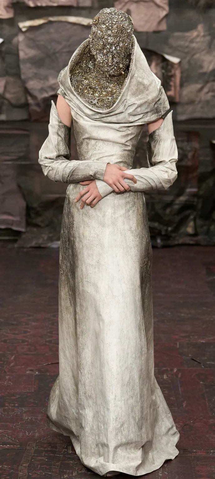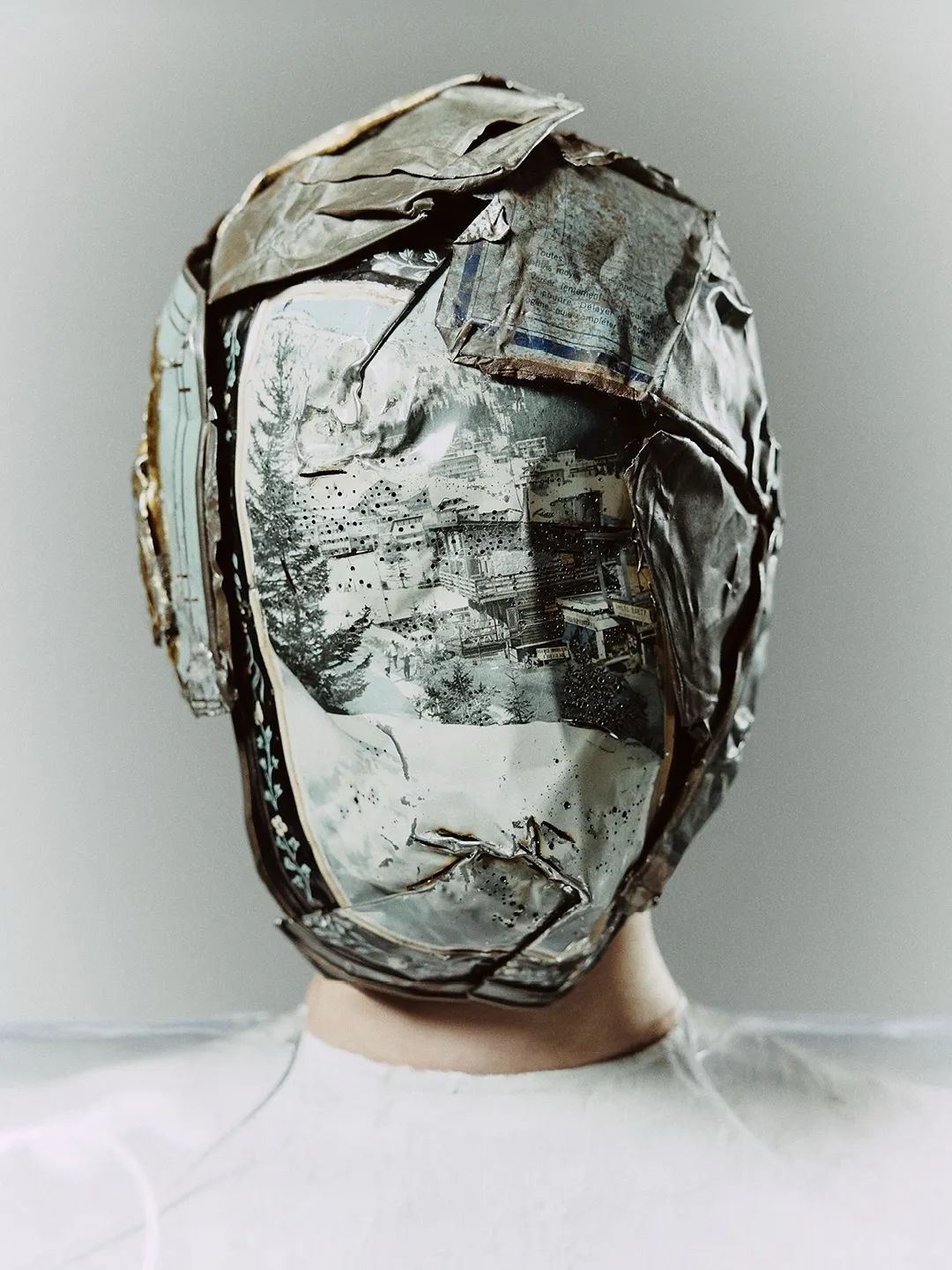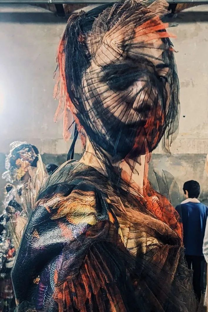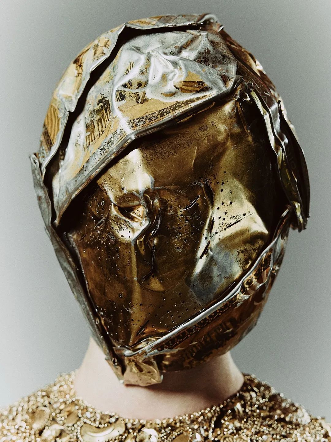 在Glenn Martens看来,Maison Margiela不需要那些超级模特的面孔加持,不需要那些big name,Maison Margiela最重要的就是作品本身,以及那些呈现作品的工艺。这些面具大多以废弃金属盒经压缩重塑制成,也有蕾丝、塑料、仿水晶、金属丝织物、皮革……与模特身上服装的材质相呼应。
