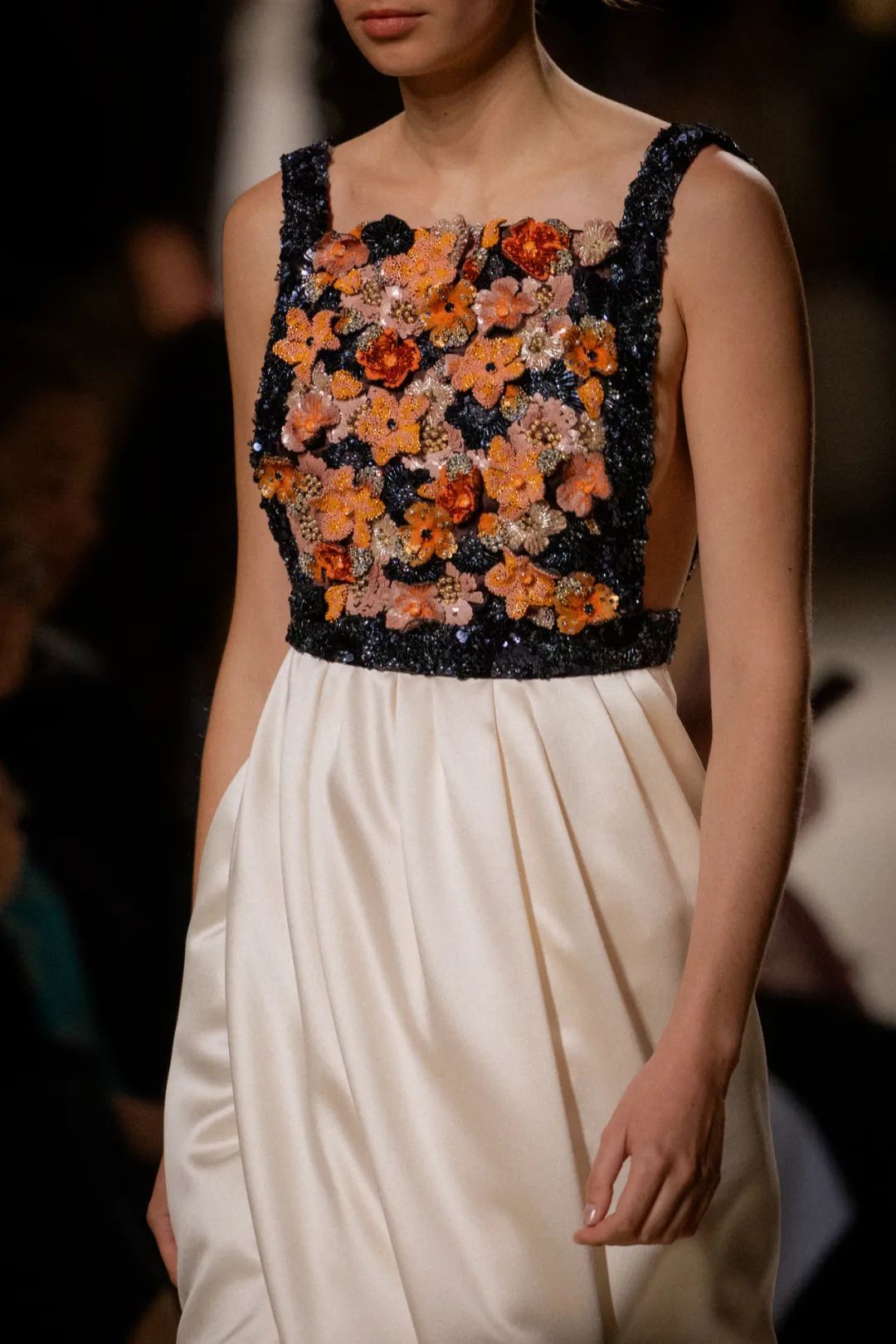 这个系列中可以辨识的重工刺绣并不如过去的作品那样显著,但绚丽多彩的花朵刺绣在水手外套与丝缎绉绸无袖连衣裙上绽放时,依然成为本季田园风情的完美注脚。