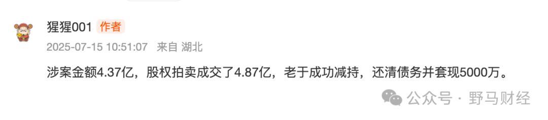 耐人寻味的是,与债权人纠纷的涉案金额只有4.37亿,股权拍卖却成交了4.87亿。有投资者戏谑:“老于成功减持,还清债务并套现5000万。”