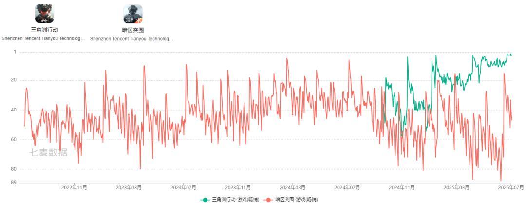 2022年7月《暗区突围》自上线之后长期稳定在国内iOS畅销榜TOP80名,并且还出现了持续两年的收入上涨,直到去年《三角洲行动》的上线。《三角洲行动》在上线之后同样出现了收入持续上涨的趋势,如今稳定在国内iOS畅销榜TOP10,相比《暗区突围》有着更高的上限。