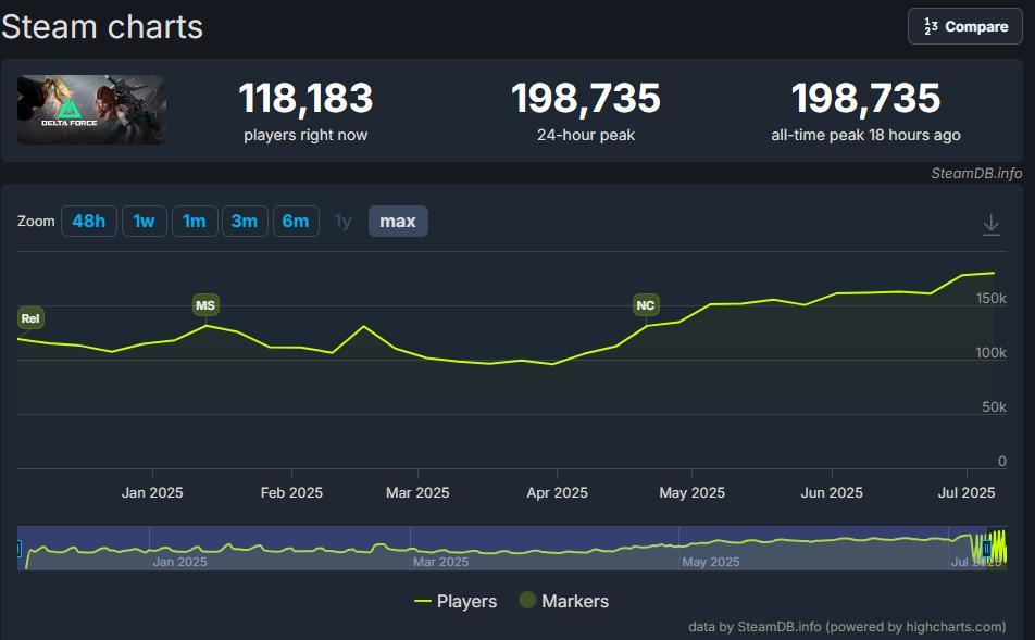 根据官方数据,《三角洲行动》在4月S4赛季之前宣布双端日活跃用户突破1200万。而从SteamDB的数据来看,S4赛季之后同时在线玩家数量开始3个月连续增长,近期峰值超过19万人。