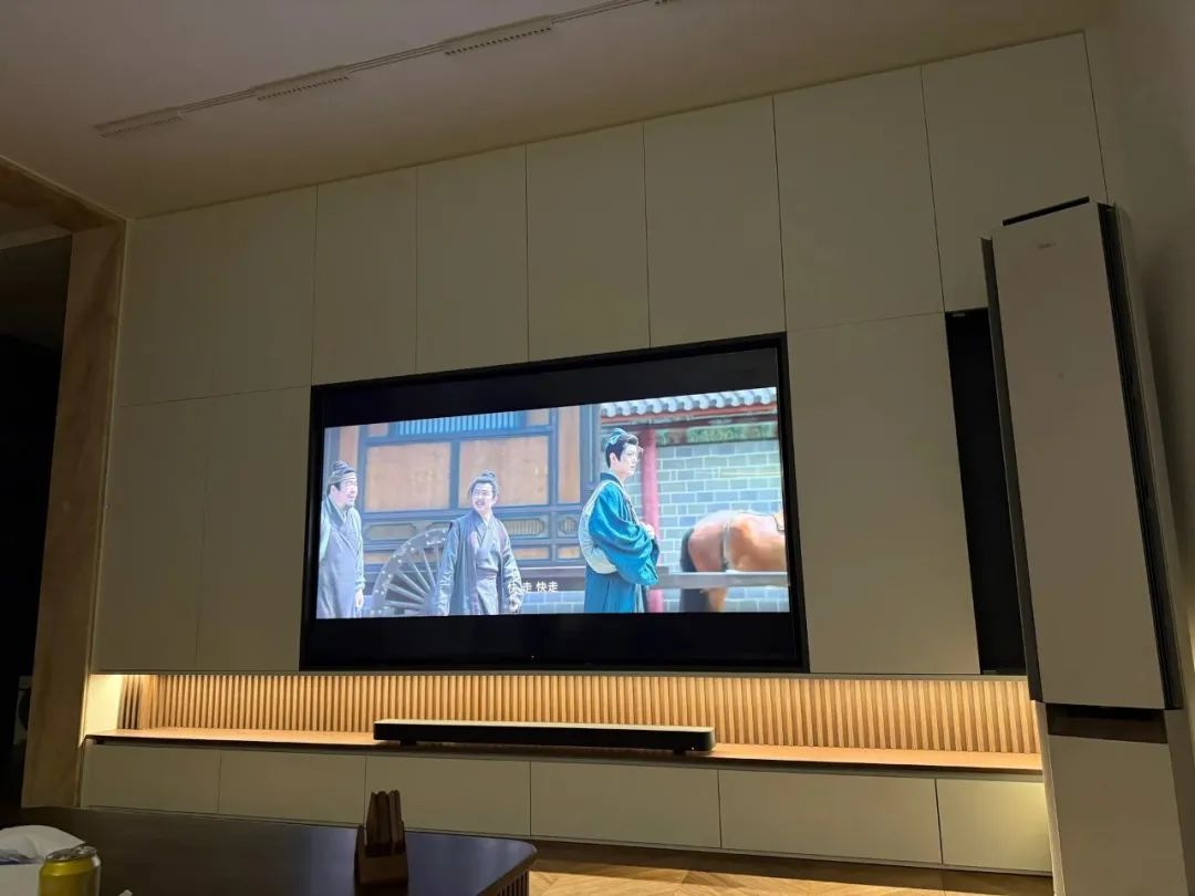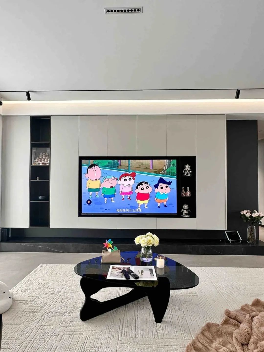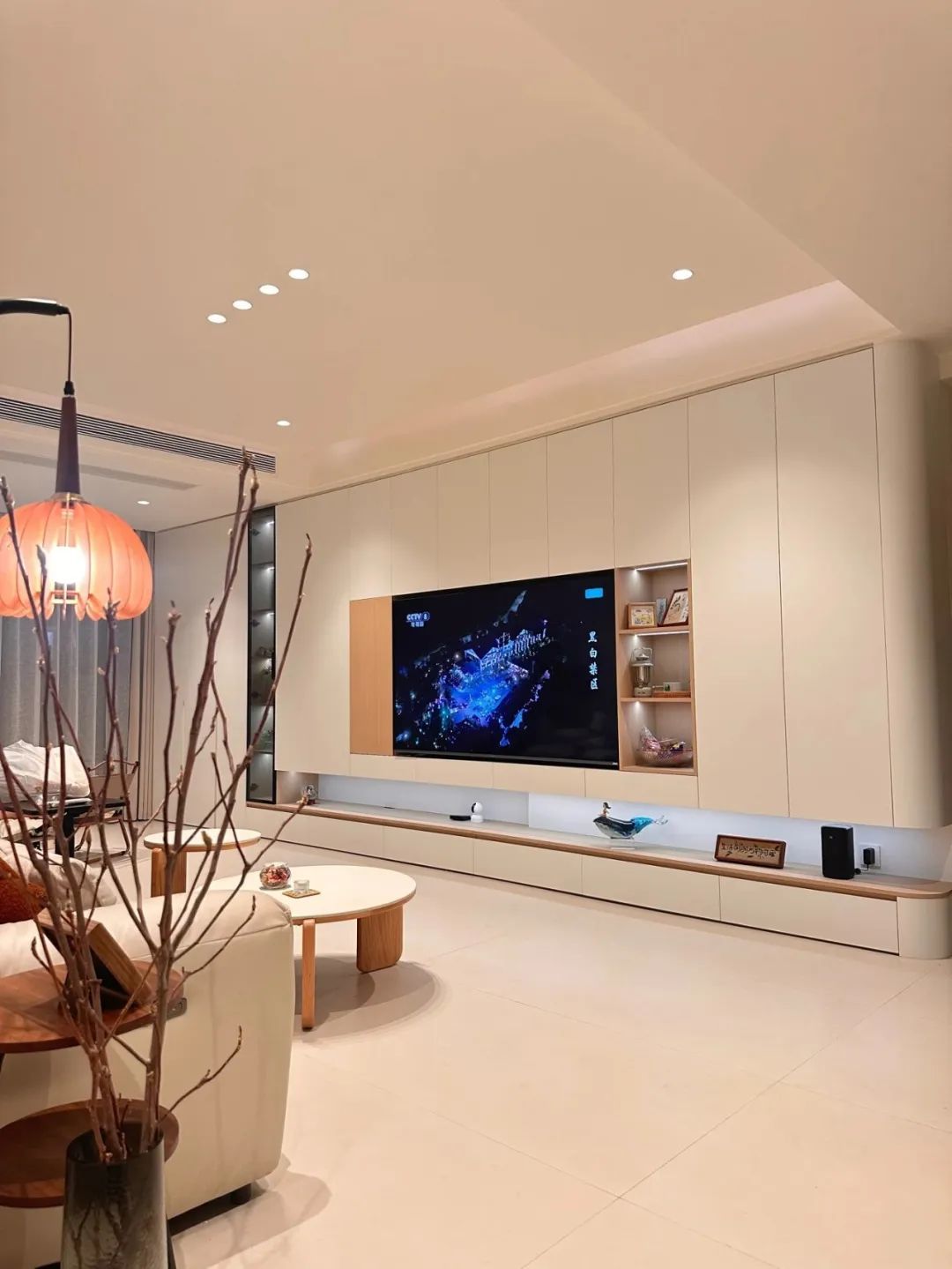 电视机必须挂墙安装! 电视柜放在台面上,底座会占用台面,增加打理难度。而把电视机挂在墙上,能节省台面的空间,视觉上也更清爽、更融入背景墙,提升整体设计感。重点是挂墙上的电视机更稳固,不容易被碰到,避免意外的发生。